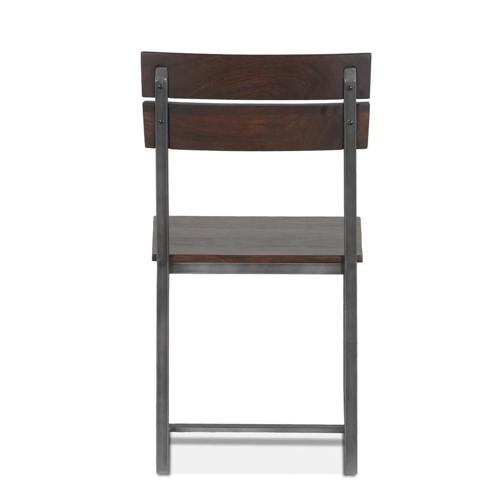 This handcrafted dining chair has an acacia wood seat and seat back with a dark brown Jacobian finish that offers durability while showcasing the natural grain and beauty of the wood. The chair’s seat rests at the standard dining height and has clean squared edges of the seat lending to its modern style. The seat includes two iron U-shaped sled legs featuring a gray rubbed finish, creating a fusion of natural and industrial elements. This dining chair is pre-assembled and is made with materials of the finest quality, making it an effortless addition to any home.