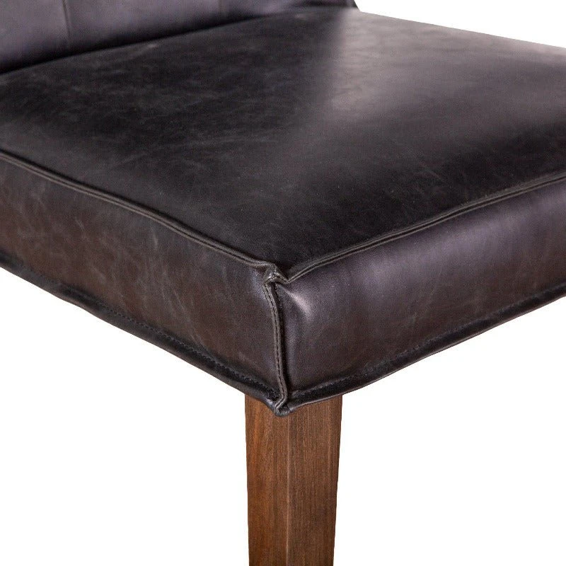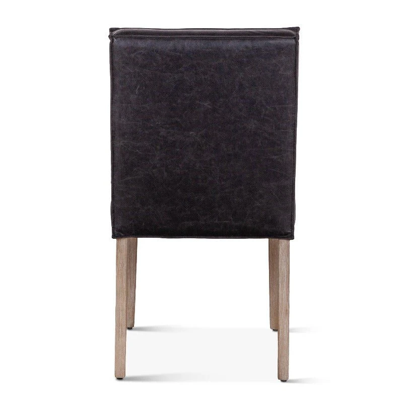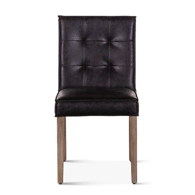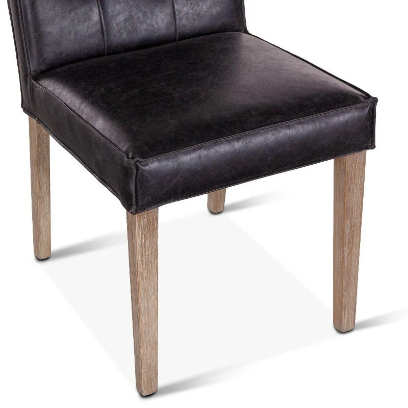 With vegan black leather wrapped around the solid hardwood frame, the Avery dining chairs are comfortable as they are eye-catching. The seat back features a square, stitched design along the front. Available in dark brown or whitewashed finish legs, this pre-assembled Avery chair is ready-to-use, and with its vintage feel, it will make an effortless addition to any home.