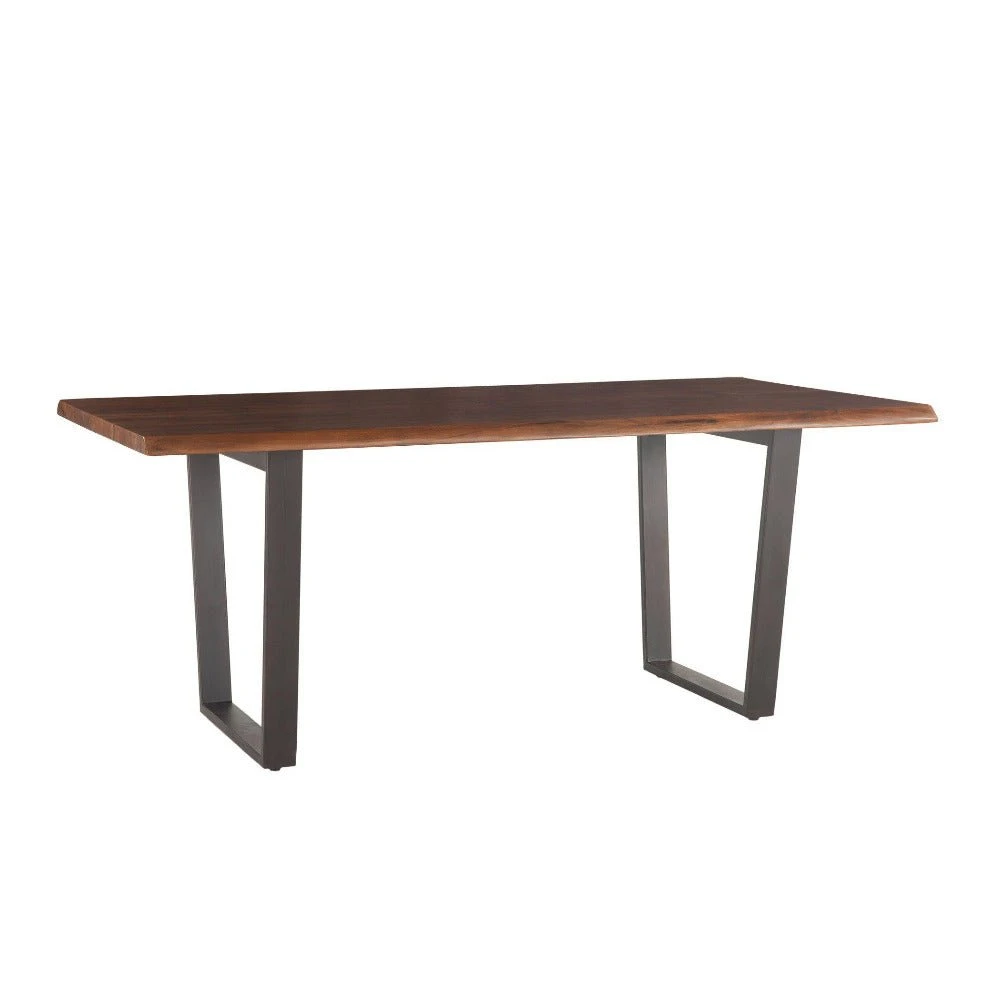 Combining organic silhouettes with modern details for a casual and transitional style, this handcrafted faux live-edge dining table is cut from a thick acacia wood slab featuring uneven edges and butterfly joinery detailing. The catalyzed water-based dark walnut finish on the wood creates an amazing luminosity that evokes beauty from every angle while also being durable for daily use. The Blayne tabletop rests atop two reclaimed iron U-shaped legs in antique zinc finish, creating a fusion of natural and industrial elements. This table requires assembly.