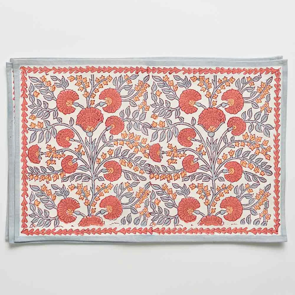 Introducing a beautiful new print that is predicted to be a best seller year round! This floral print showcases periwinkle vines with warm orange blooms and earthy undertones. Perfect for day or night and all seasons, it is sure to bring a colorful but calming energy to your dining experience.