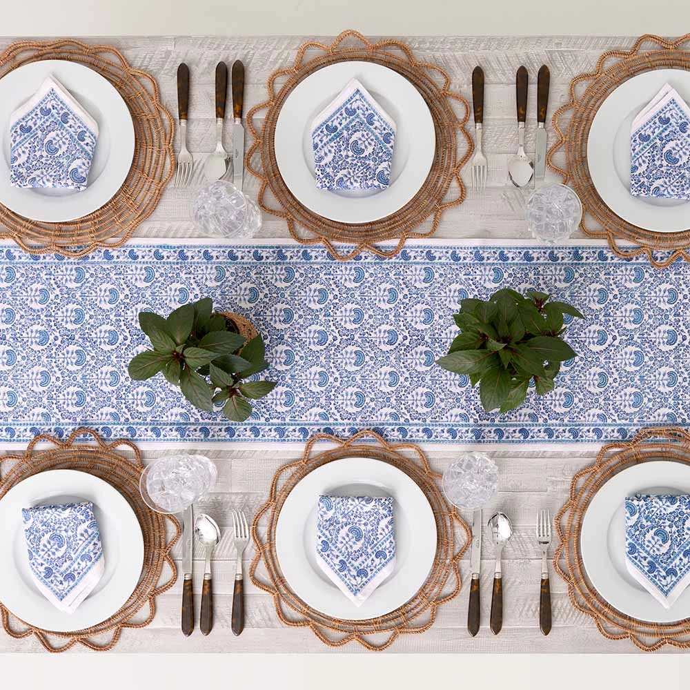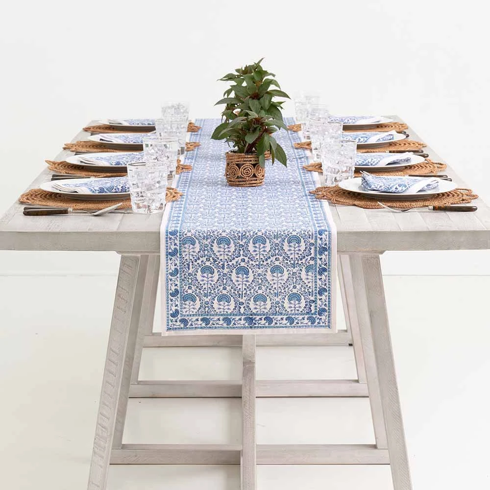 Elevate your table setting with our Caroline Blue Table Runner. The intricate pattern of our Caroline print brings a modern, slightly exotic look to your table. The warm hues of blue add a finishing touch for relaxed dining and entertaining. Handcrafted in India from 100% cotton.