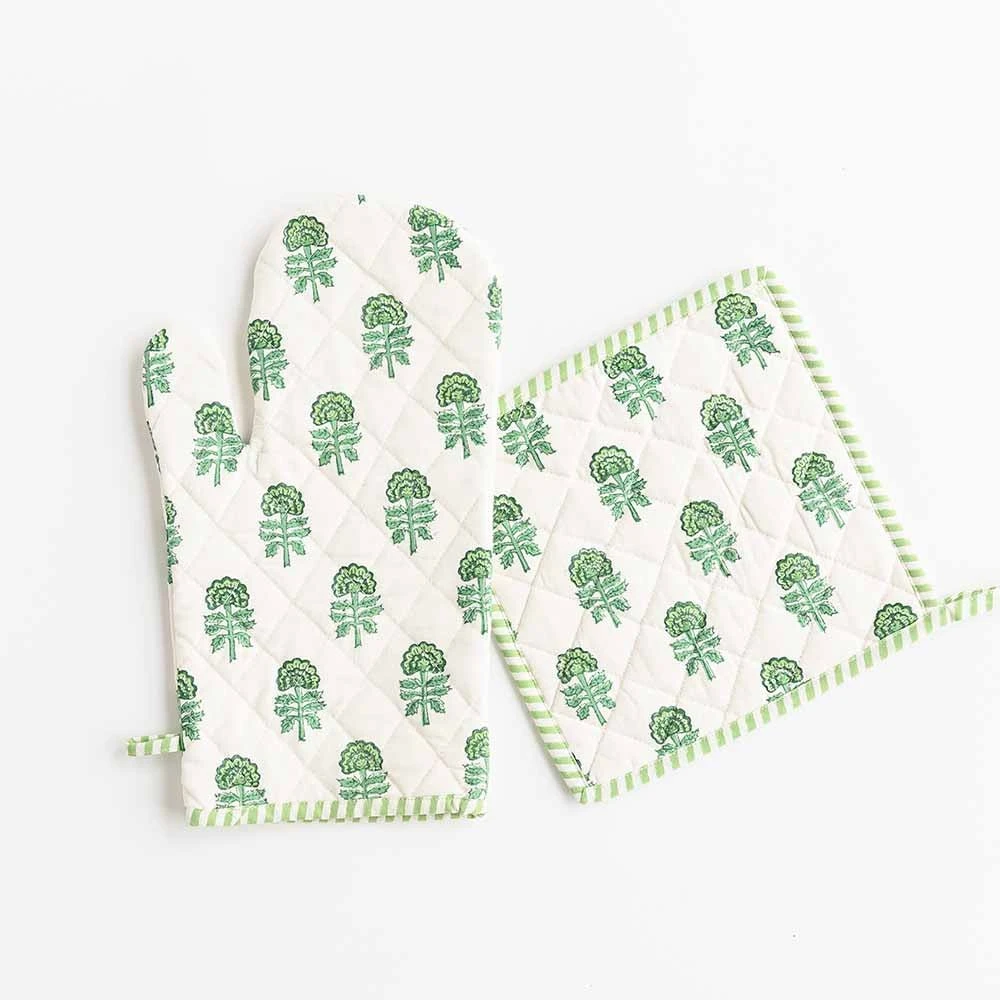 A modern yet globally inspired kitchen oven mitt set in green and white hand block printed cotton in a practical adjustable style with deep pockets. Green hues will add style to your kitchen, edged with a striped trim. Pairs well with matching tea towels and oven mitts for gift for the special chef in your life!
