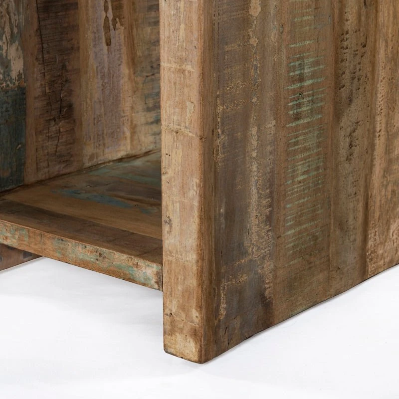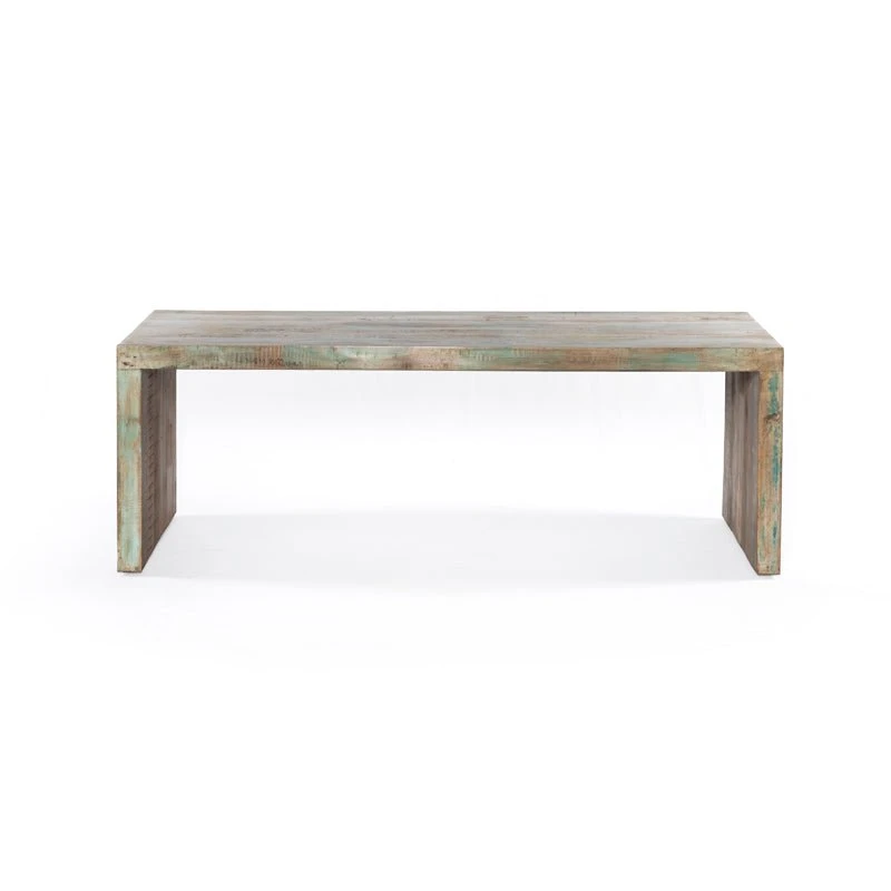 This hand-crafted coffee and side table set is fashioned from reclaimed wood with a patina teal finish, which offers durability while showcasing the natural grain and beauty of the wood. The 2-inch thick table top has clean, squared edges highlighting the simple design of the piece. With their slim frames, these coffee and side tables are the perfect set for accompanying a casual living room. All three tables are pre-assembled and ready-to-place.