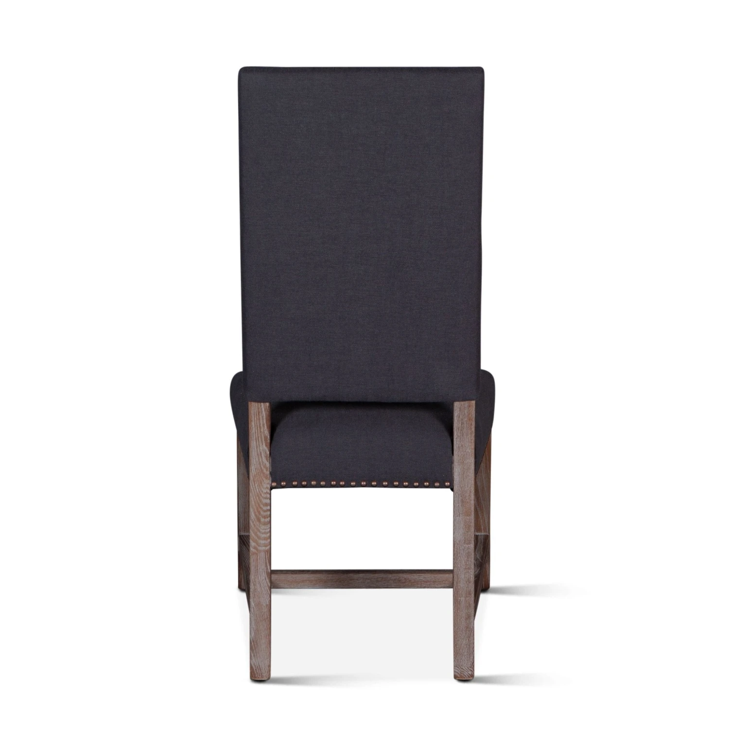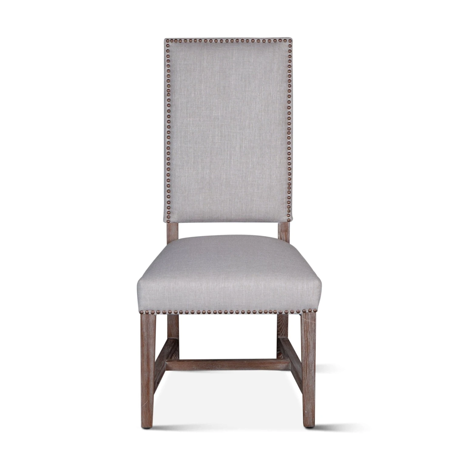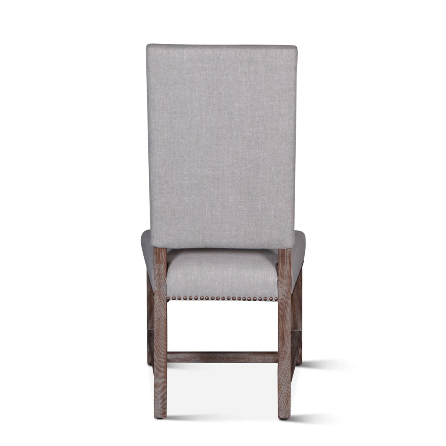 The Dani chair brings sophistication to any setting. The high back formal parsons style design works well with larger dining tables or as a captain’s chair. The frame and base of this chair are constructed from solid oak and feature a gently distressed gray wash finish. The chair is upholstered with a natural linen lined with bronze studs.Â