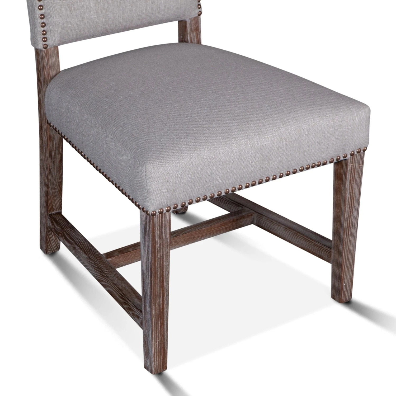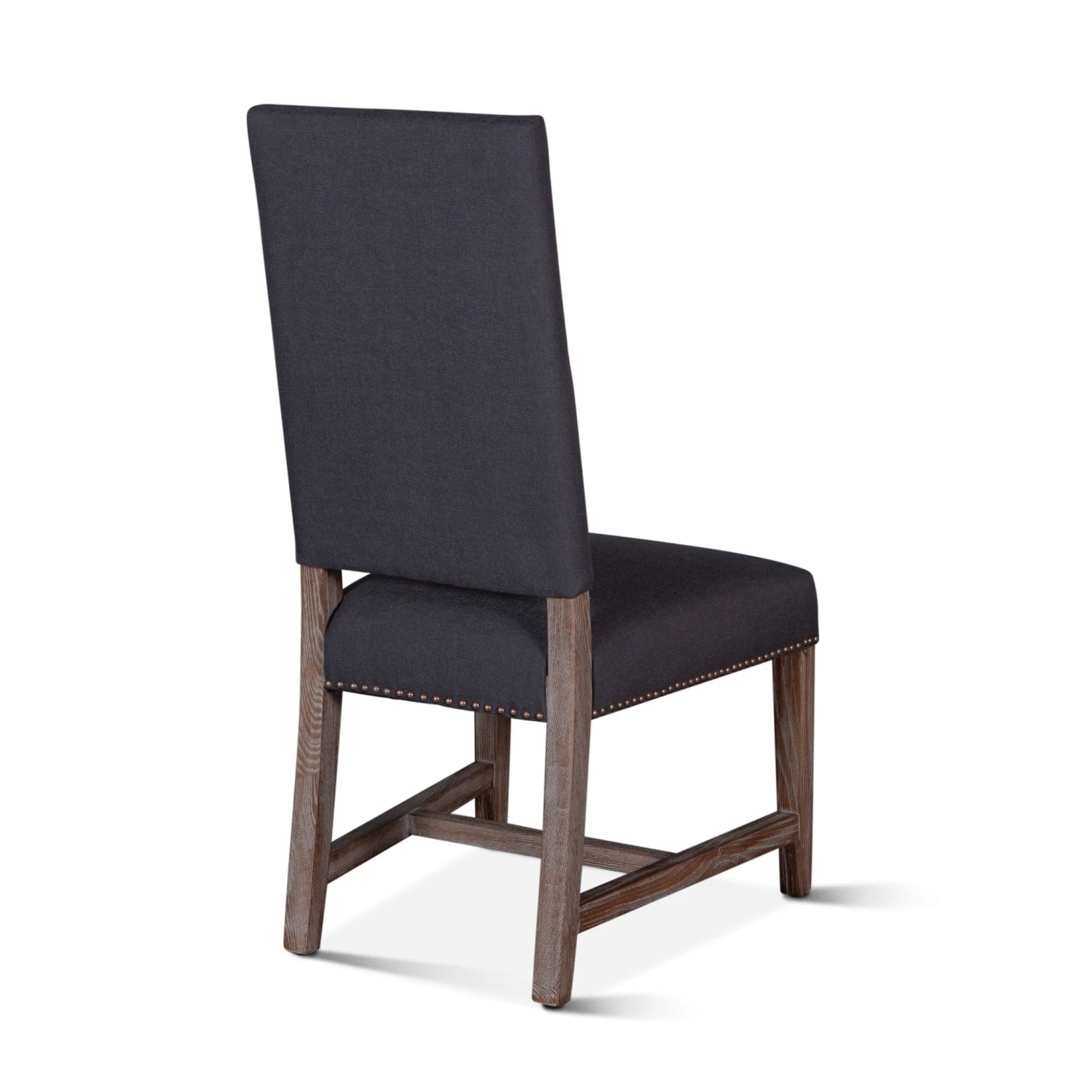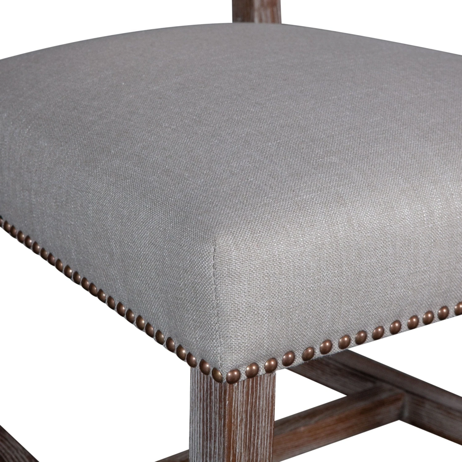 The Dani chair brings sophistication to any setting. The high back formal parsons style design works well with larger dining tables or as a captain’s chair. The frame and base of this chair are constructed from solid oak and feature a gently distressed gray wash finish. The chair is upholstered with a natural linen lined with bronze studs.Â