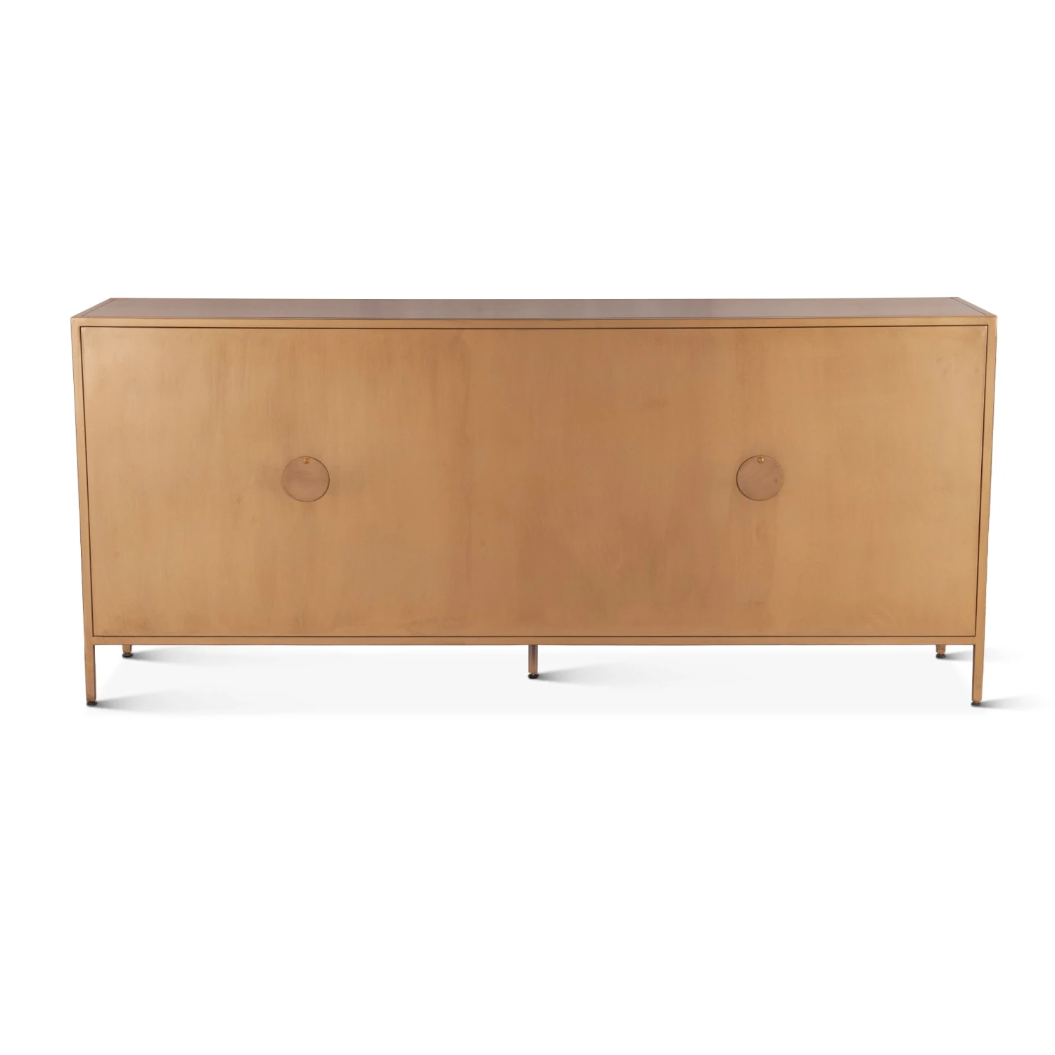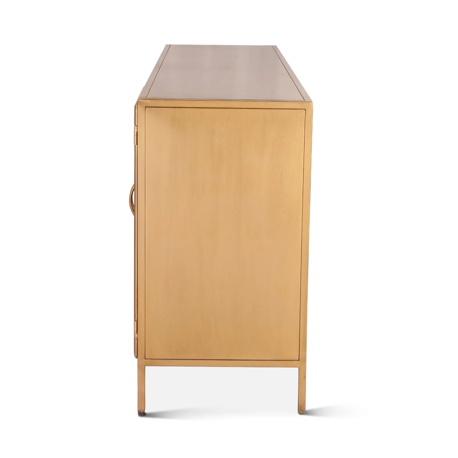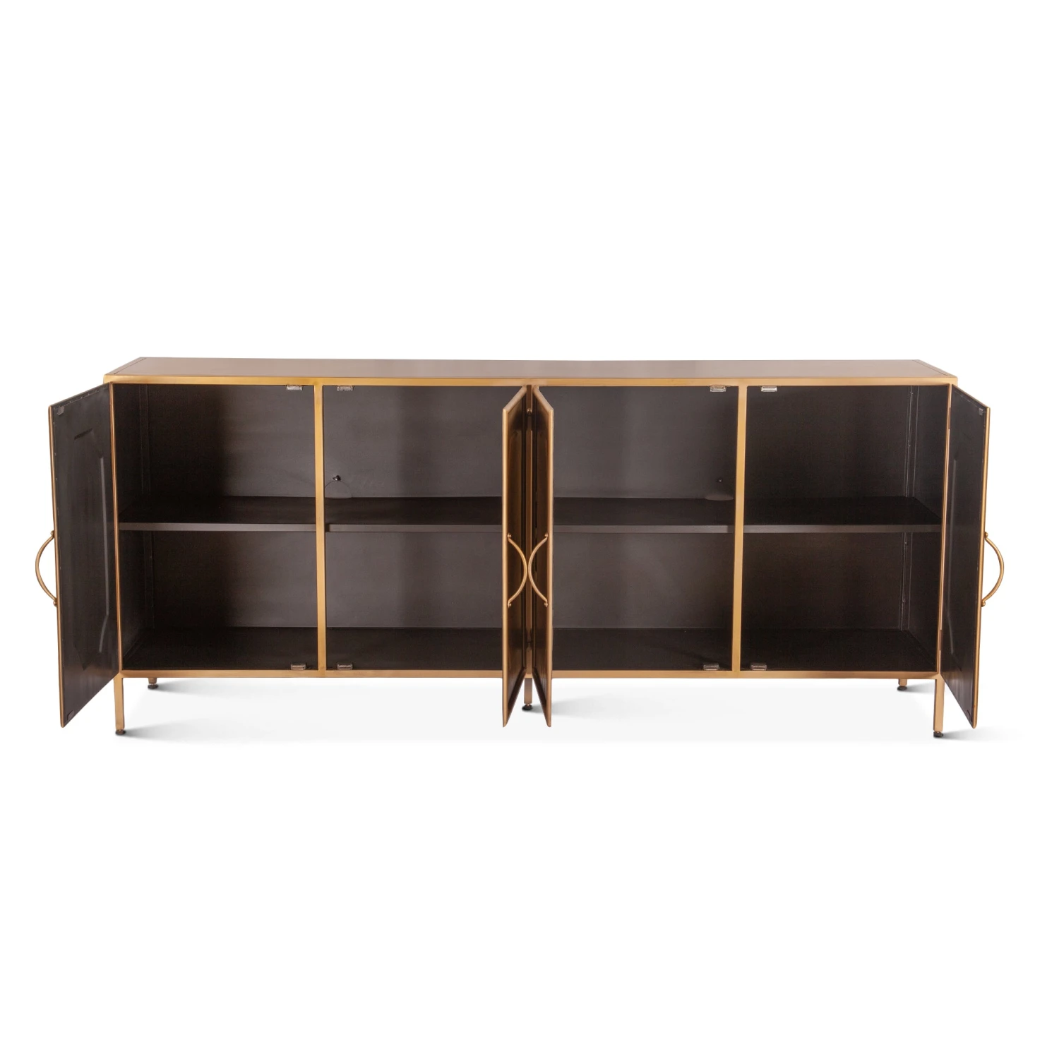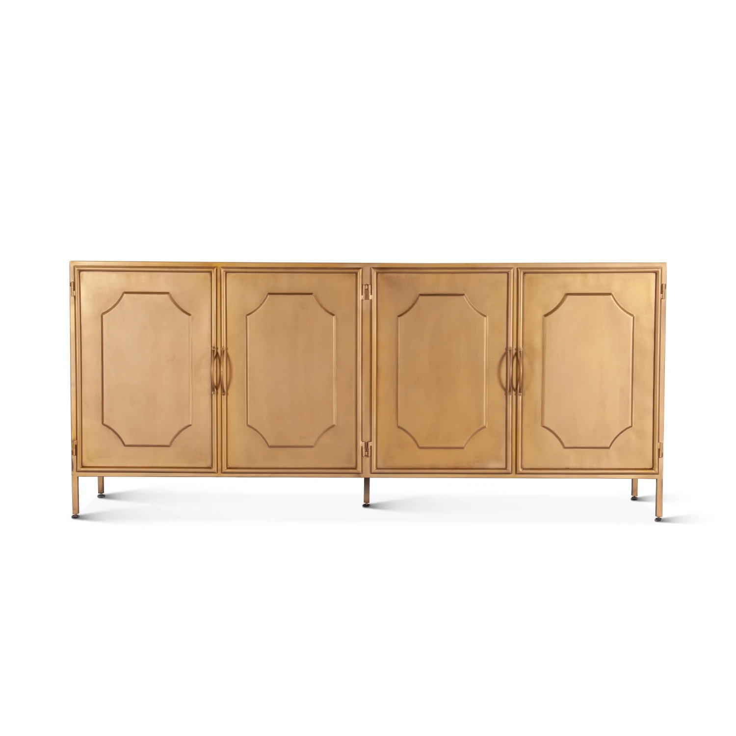 Enrich your home with the rich elegance of the Del Oro 78″ Sideboard. Revel in the timeless beauty of the eye-catching antique gold finish, crafted from solid iron to create a lasting piece of furniture that elevates any living or dining space. Providing ample storage, its mid-century modern design grants sophistication and luxury.Â