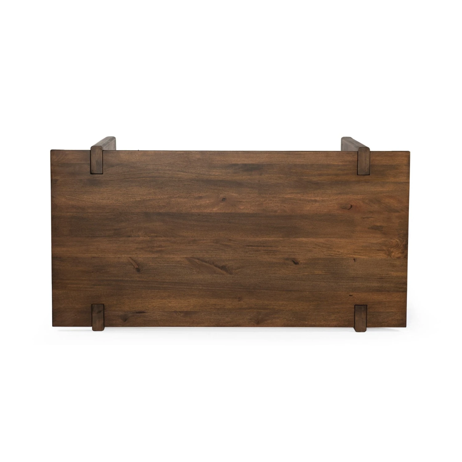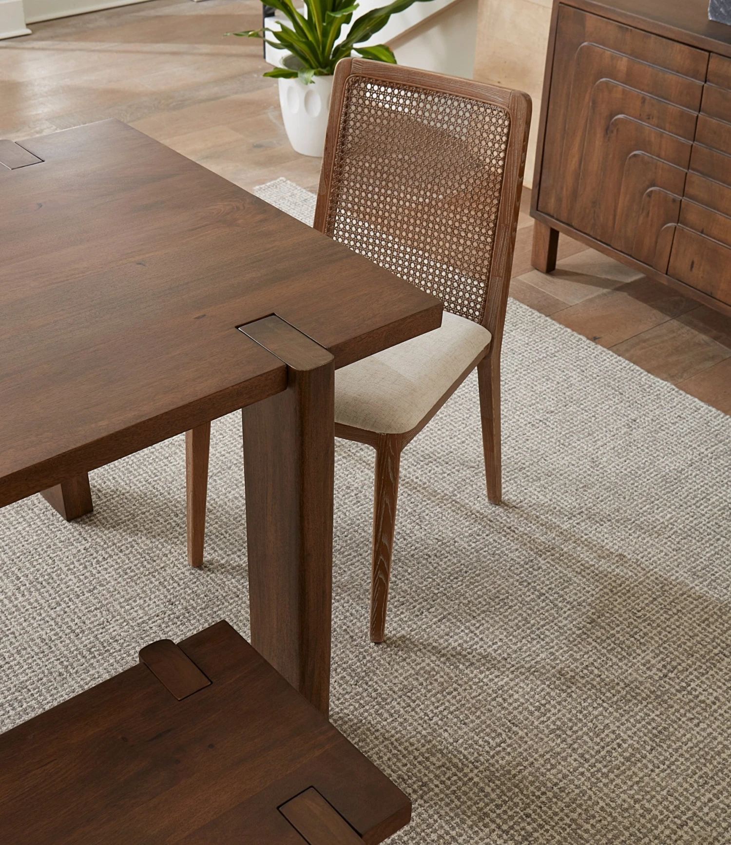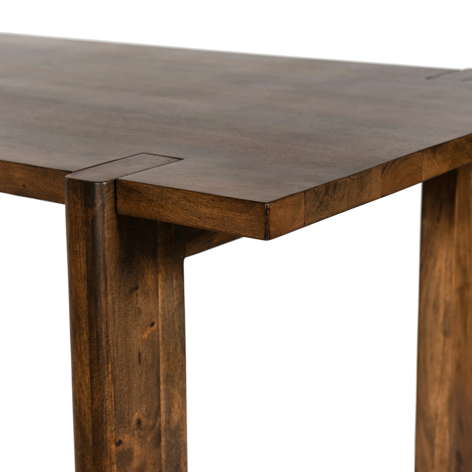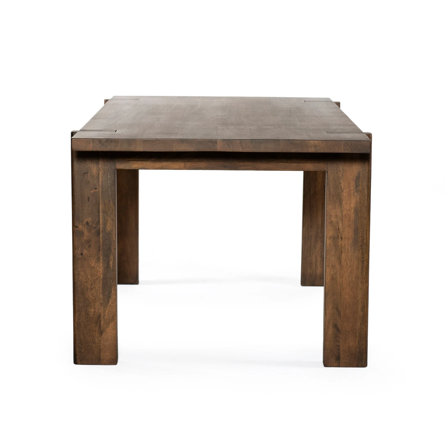 - Solid mango wood dining table with a hand-applied, moisture resistant finish in acorn brown