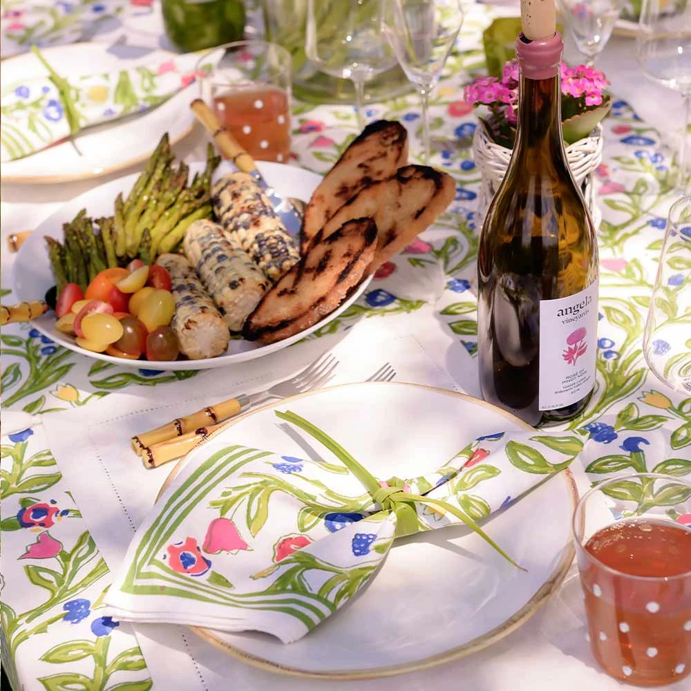 The essential Spring pattern! Hand painted flowers stretch across the vine in vibrant shades of yellow, blue and red. Our Emma Napkin is a lively, hand blocked print that will add an at-home and welcoming look to your table setting.