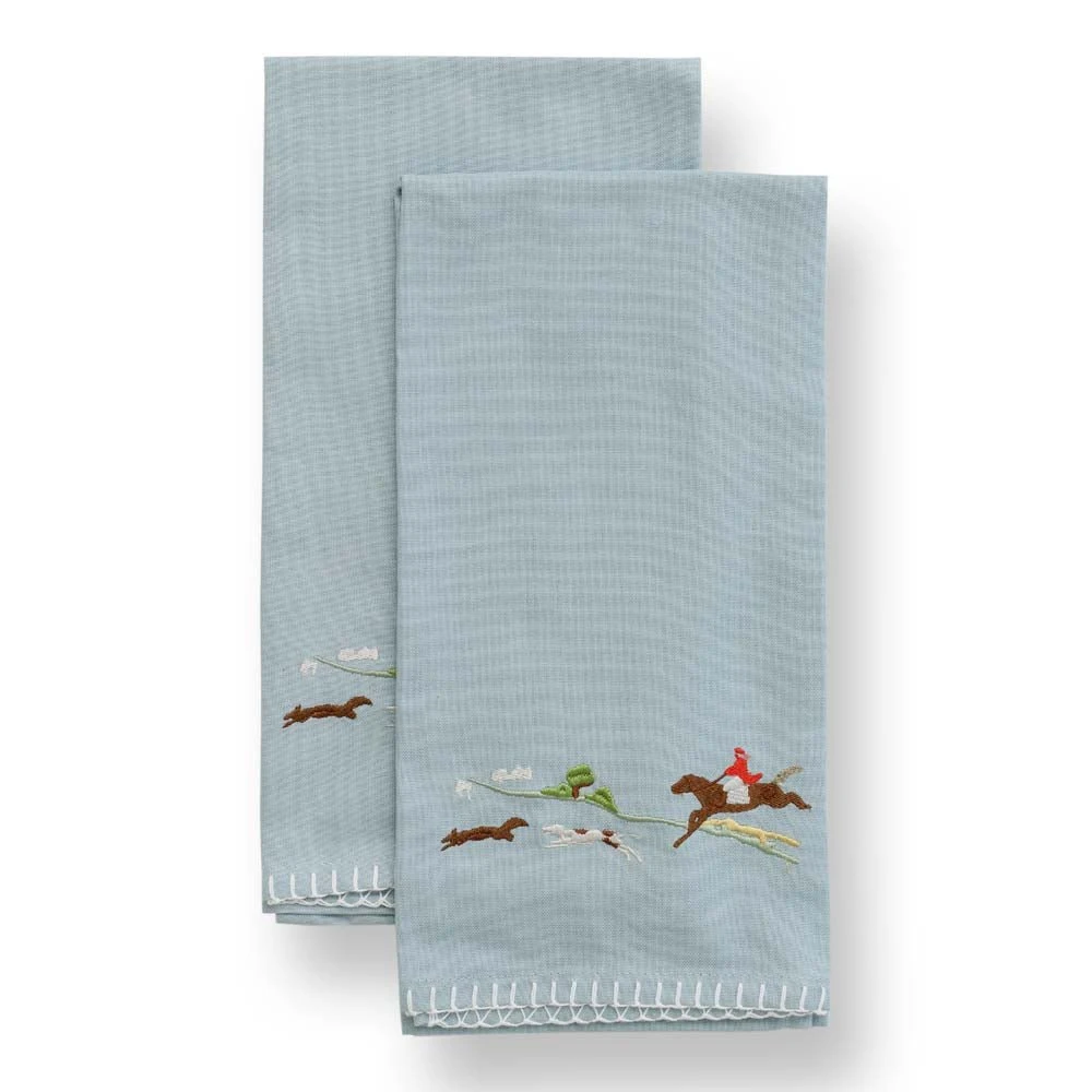 The hunt is on with these embroidered tea towels. This classic scene depicts a jumping horse with rider and his faithful hound giving chase to the escaping fox. Great gift for any equestrian or hunting enthusiast.