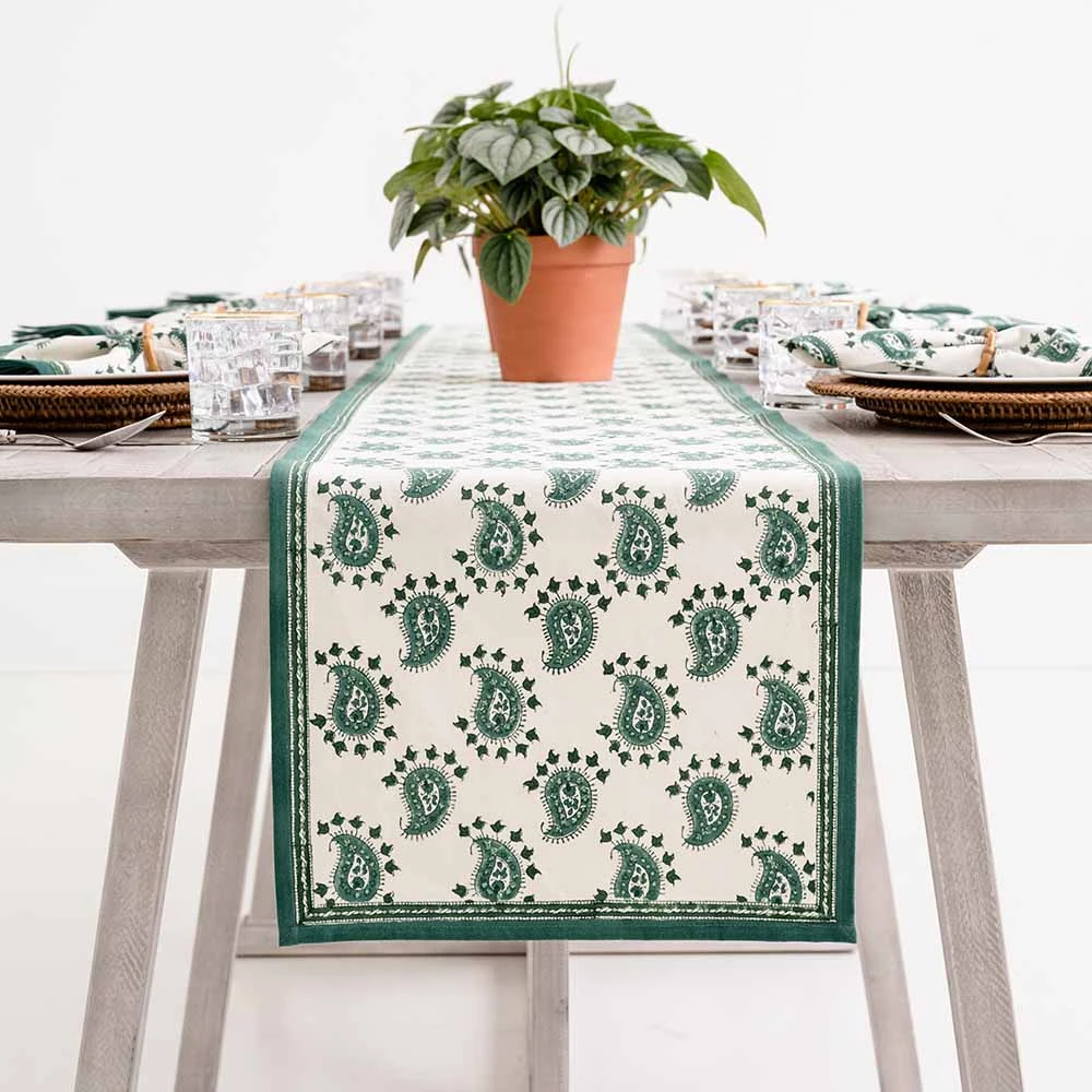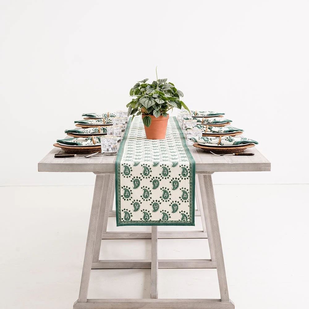 This green paisley table runner will bring lovely charm to your dining experience. Made with 100% Cotton fabric these dinner napkins are soft cloth napkins which provide a light but cozy feel to your dining table. These cloth napkins are a great way to make your dining table welcoming. Pair with one of our tablecloths, placemats, or table runners for the complete effect.Â