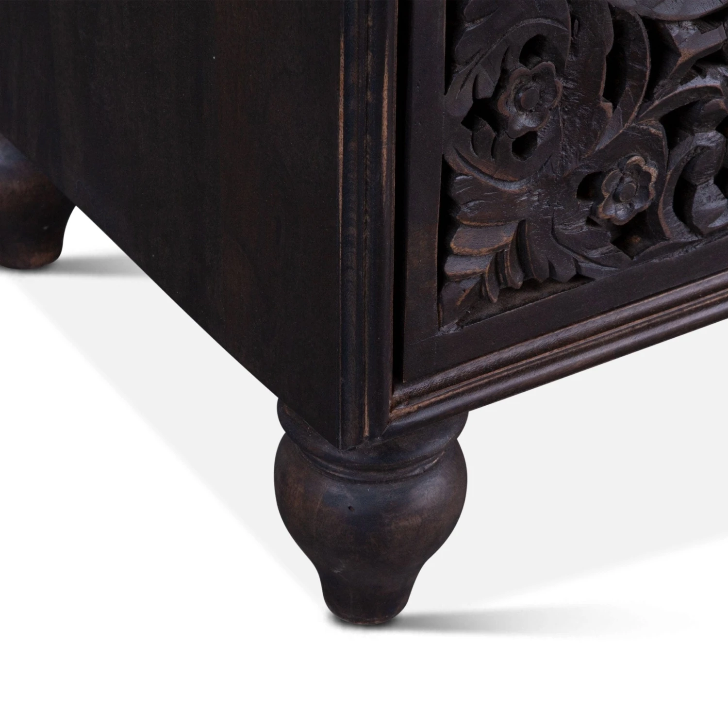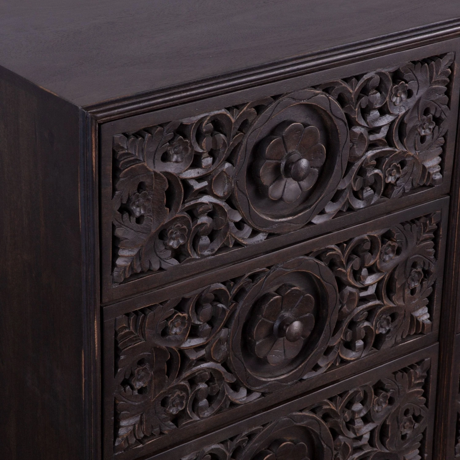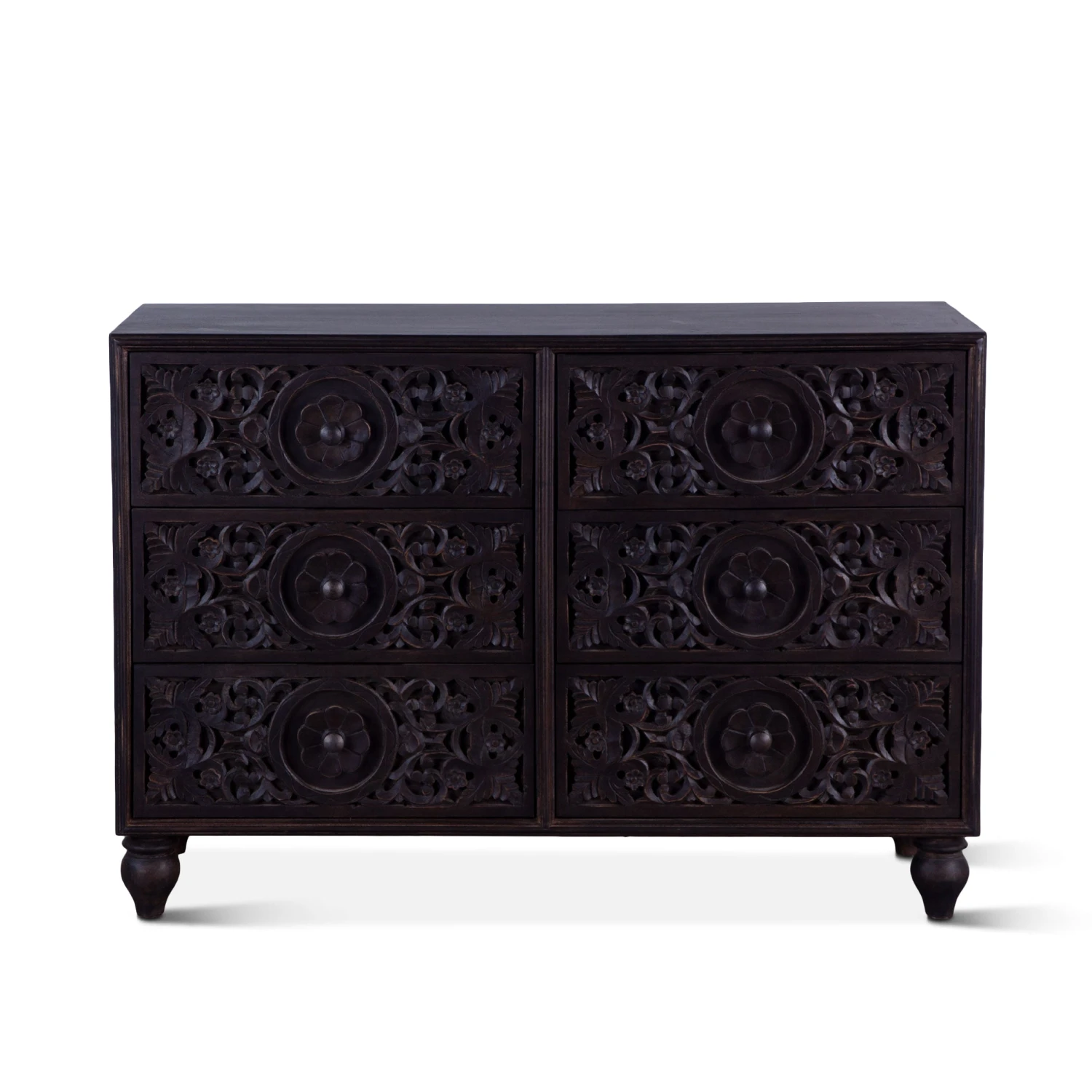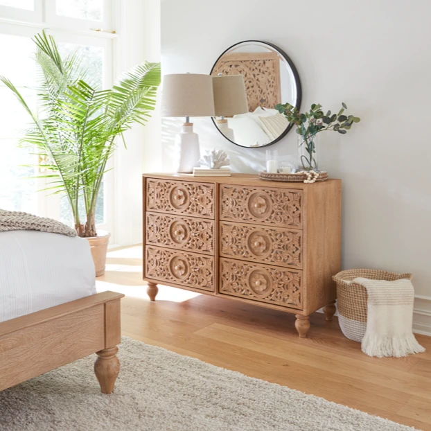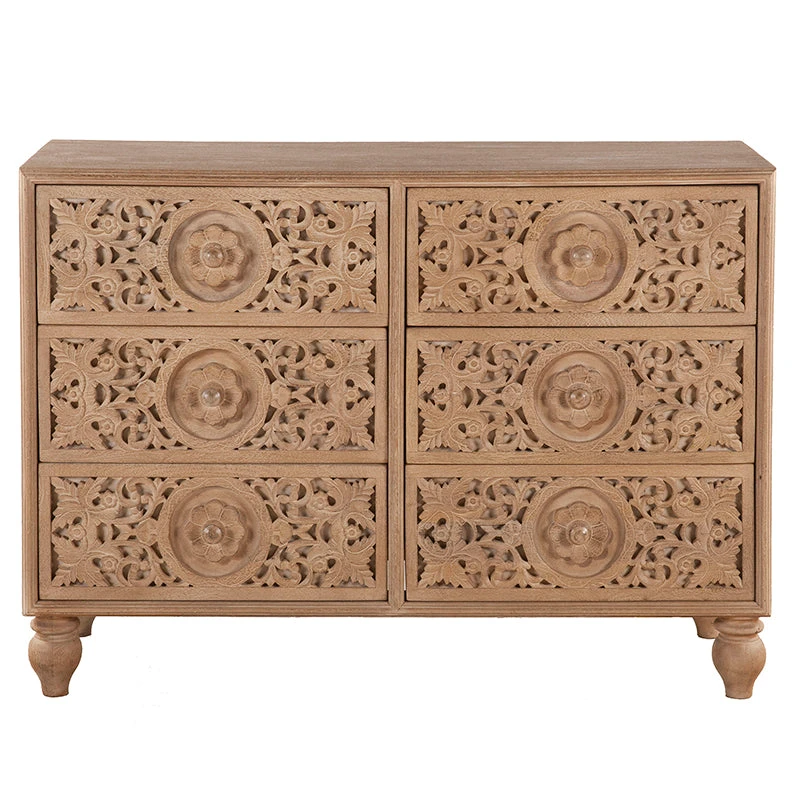 With six drawers, three stacked on either side and each with a small knob handle on the front bordered by a floral carving, this dresser provides enough room to house all your favorite clothes. The dresser rests atop a pair of hand turned, heirloom quality mango wood legs, further emphasizing the attention to detail that this piece evokes. This pre-assembled dresser is made with materials of the finest quality, making it the perfect addition to any bedroom.