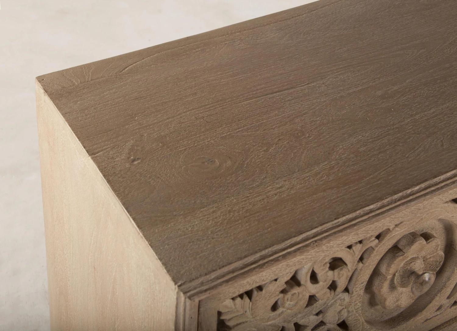Inspired by Indian culture and architecture, the Haveli collection of furniture is crafted from sustainable mango wood featuring finishes that highlight the natural beauty of each piece. This collection showcases hand turned legs and remarkable floral and geometric pattern detailing hand-carved in the wood by our highly skilled artisans, creating a stunningly dramatic statement. This beautiful dresser features a water-based, catalyzed, natural whitewash finish that enhances the carvings and complements a variety of styles, while also offering durability for daily use.