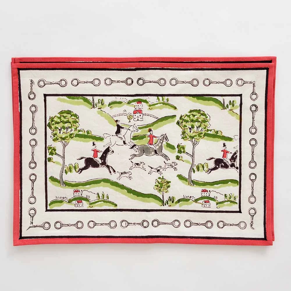 Off to the hunt! For the equestrian enthusiast, elevate your table scape with our exclusive equestrian collection of hunt scene placemats. Featuring our unique hunt scene print with a red and snaffle border, this print brings sophistication to everyday and formal gatherings.