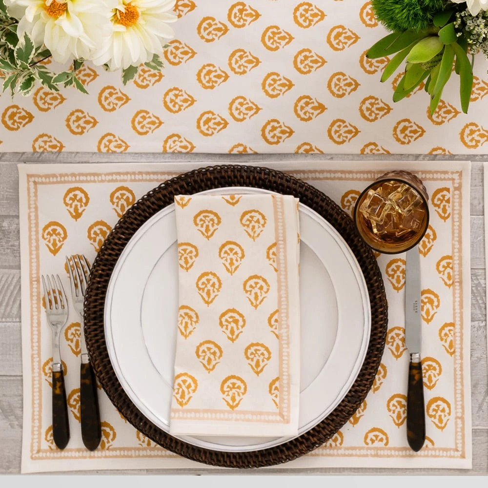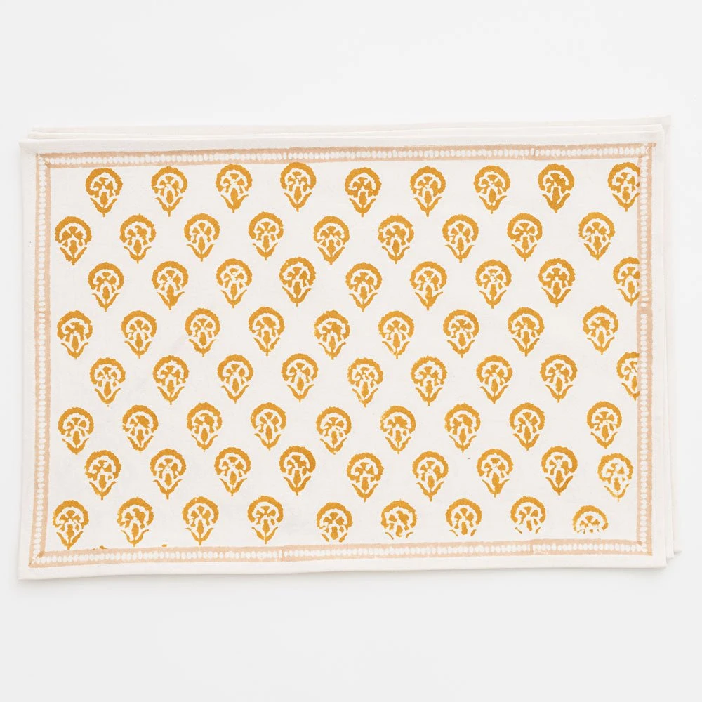 This beautiful set of 100% cotton hand blocked printed placemats in Carnation Golden is intended to be mixed haphazardly together with the other patterns, just as our families are.