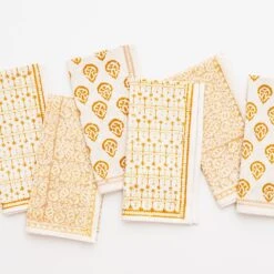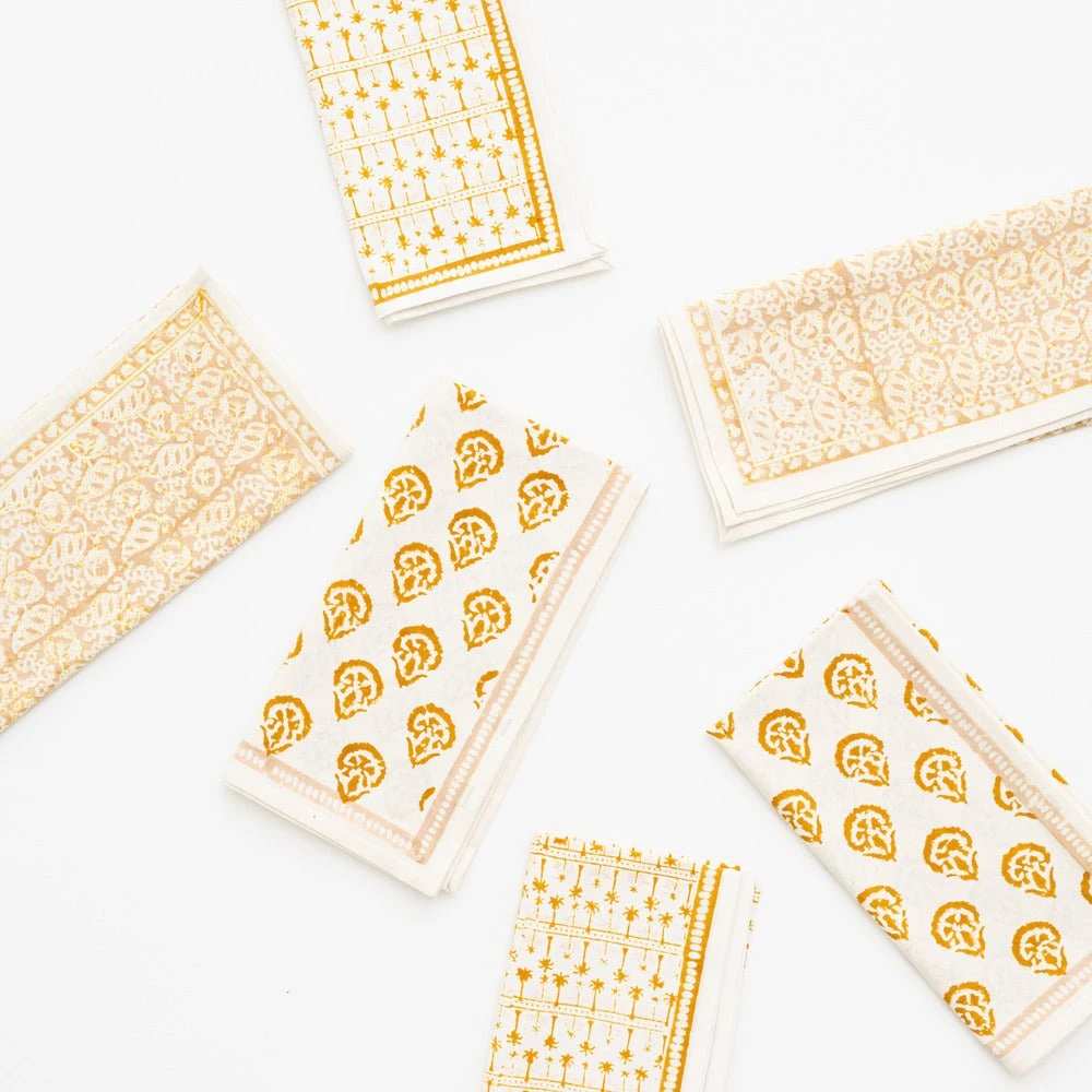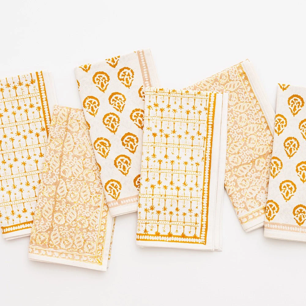 This beautiful mixed set of 100% cotton hand blocked printed napkins in golden are intended to be mixed haphazardly together, just as our families are.