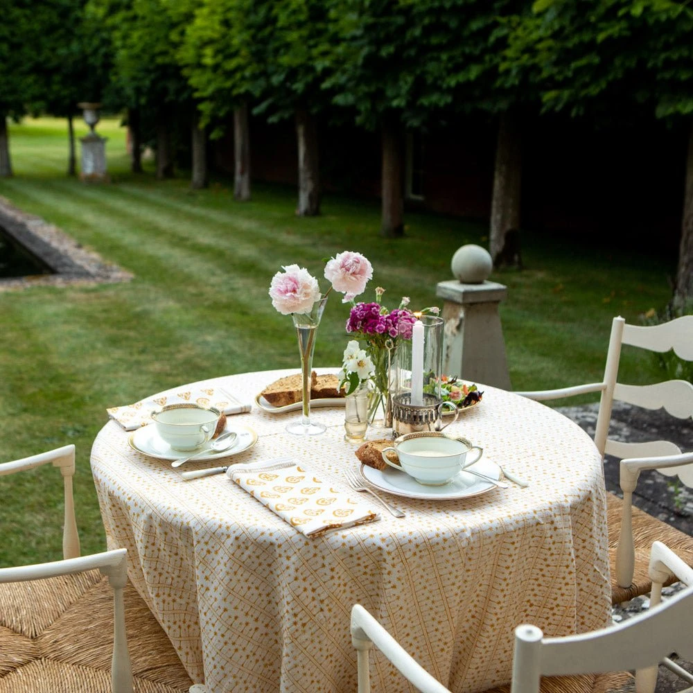 This beautiful 100% cotton, hand blocked printed Tablecloth in Palm Avenue Golden is intended to be mixed haphazardly together with the other patterns, just as our families are.