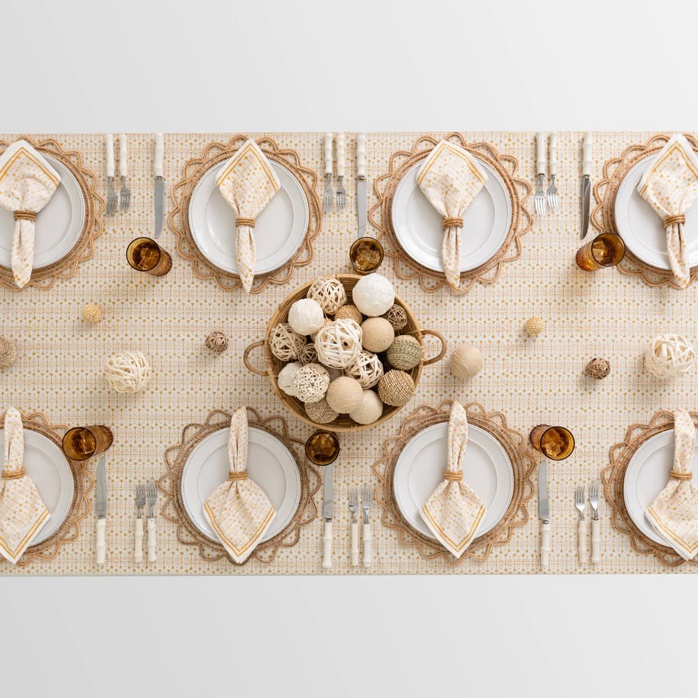 We seized the power of color and pattern to fill our Endless Summer Collection with optimism and joy. Our Palm Avenue Golden Tablecloth is inspired by the GOLDEN sunshine of a Bahamas summer day, and patterns borrowed from the reassuring avenue of palm trees that have stood proud in our garden.Â