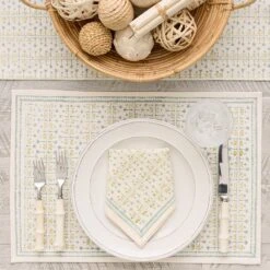 This beautiful set of 100% cotton hand blocked printed placemats in Palm Avenue Seafoam is intended to be mixed haphazardly together with the other patterns, just as our families are.