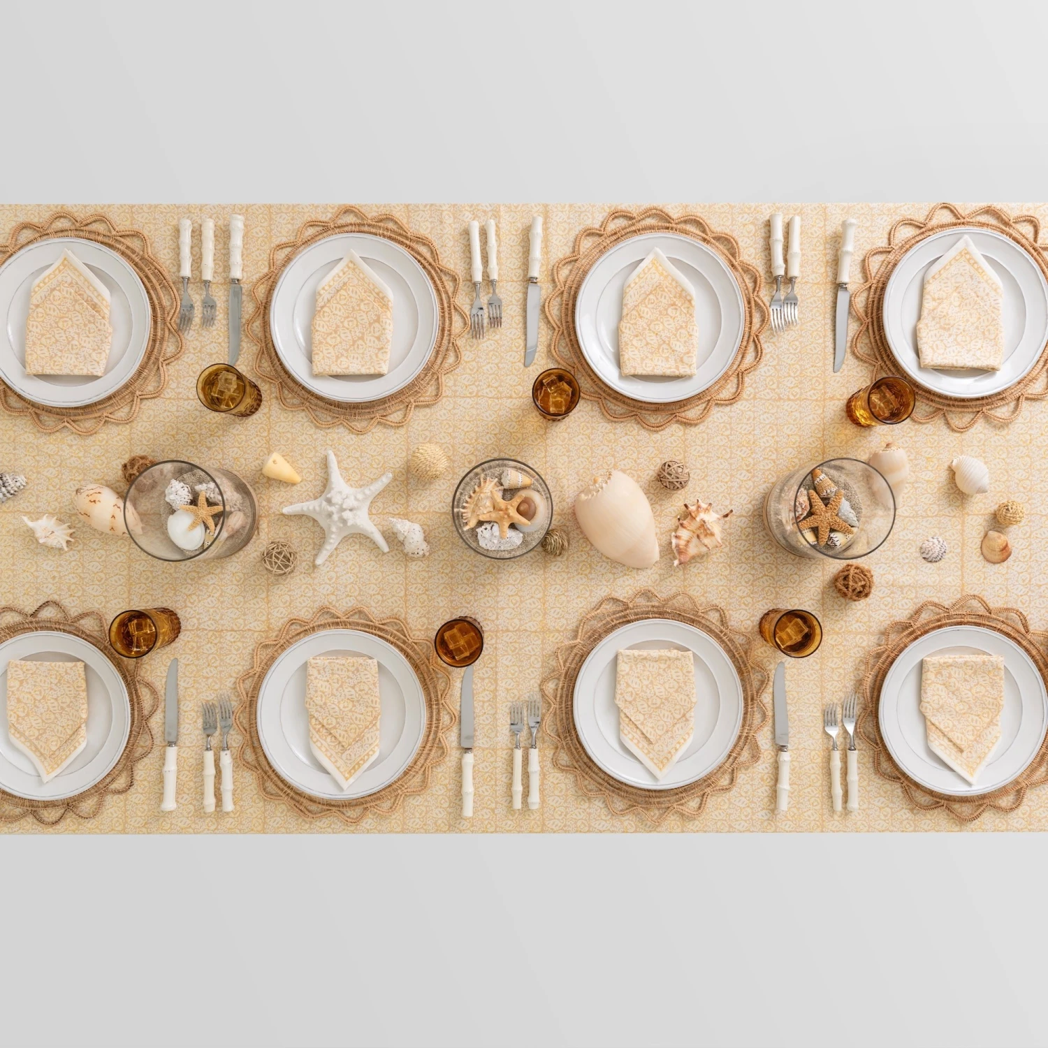 This beautiful 100% cotton, hand blocked printed Tablecloth in Seashell Golden is intended to be mixed haphazardly together with the other patterns, just as our families are.