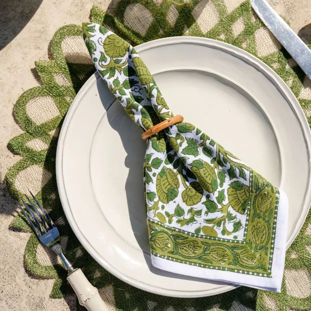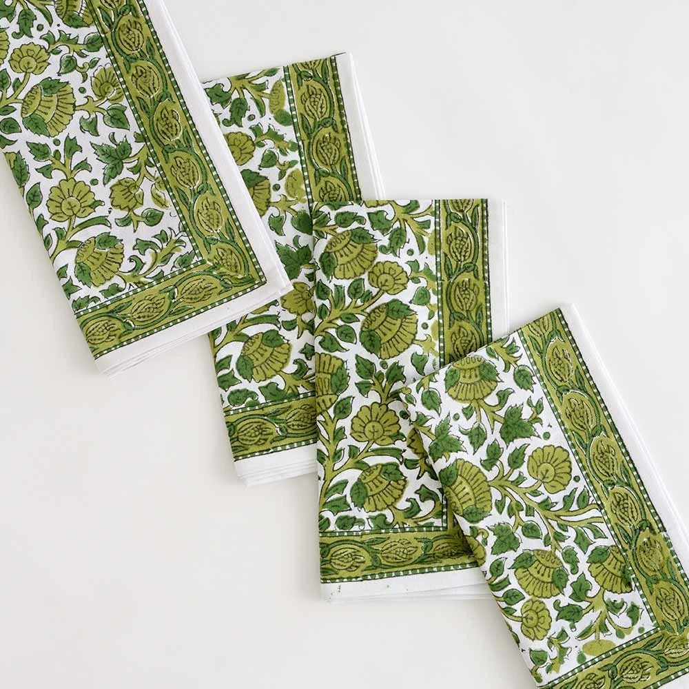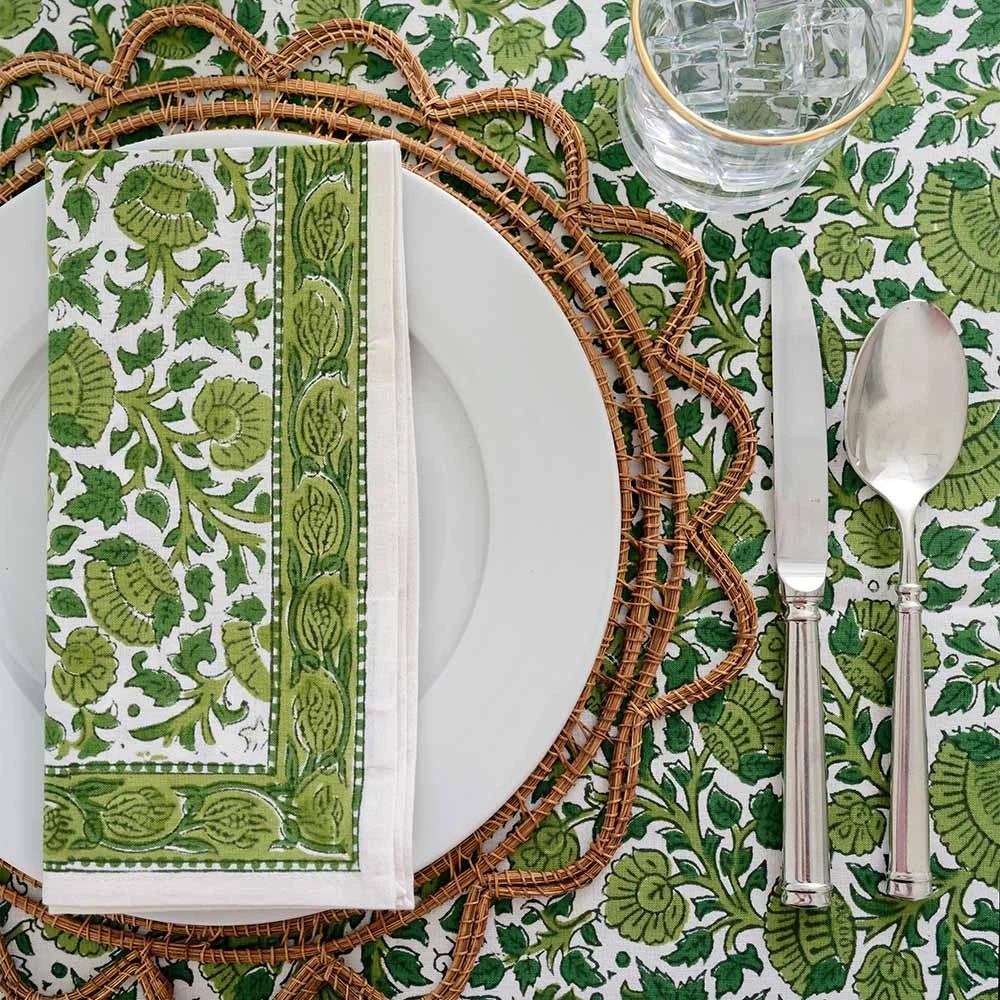 boho inspired green floral block printed cotton napkins will bring cheer to your dining table and brighten your home. Perfect to mix and match, complete the set with co-ordinating placemats, table runners and tablecloths.Â