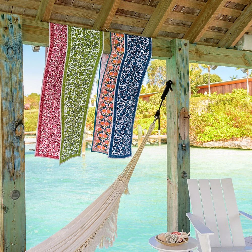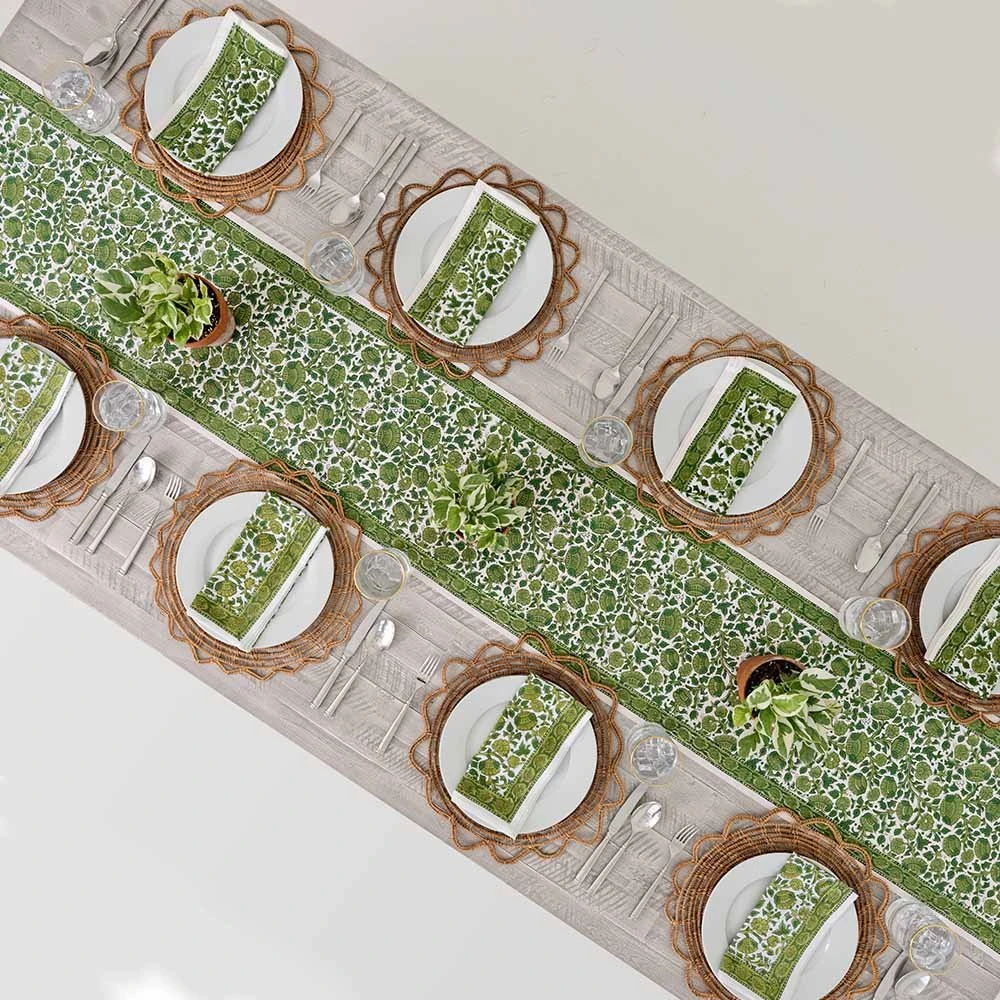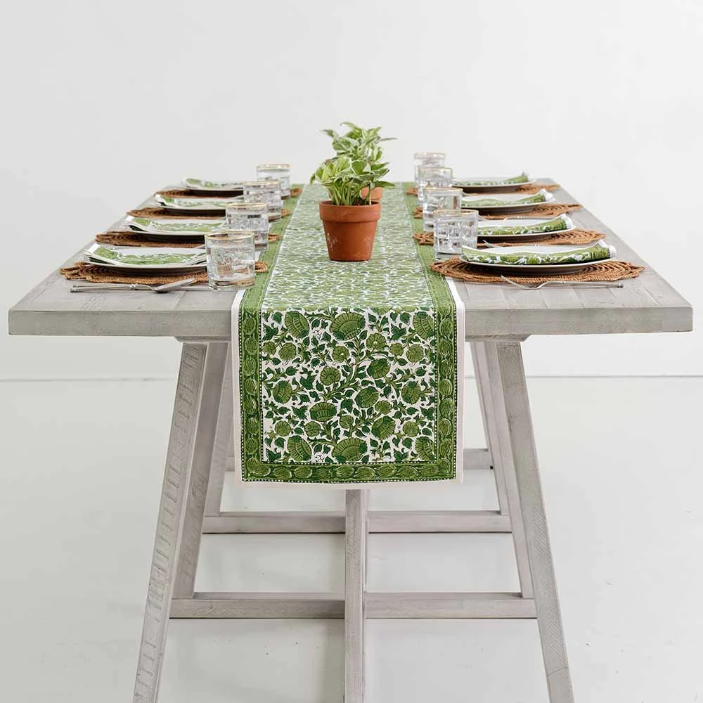Our vibrant blossoms collection is both elegant and fun. This boho inspired green floral block printed canvas table runner will bring cheer to your dining table and brighten your home. Perfect to mix and match, complete the set with co-ordinating napkins, placemats, and tablecloths.Â