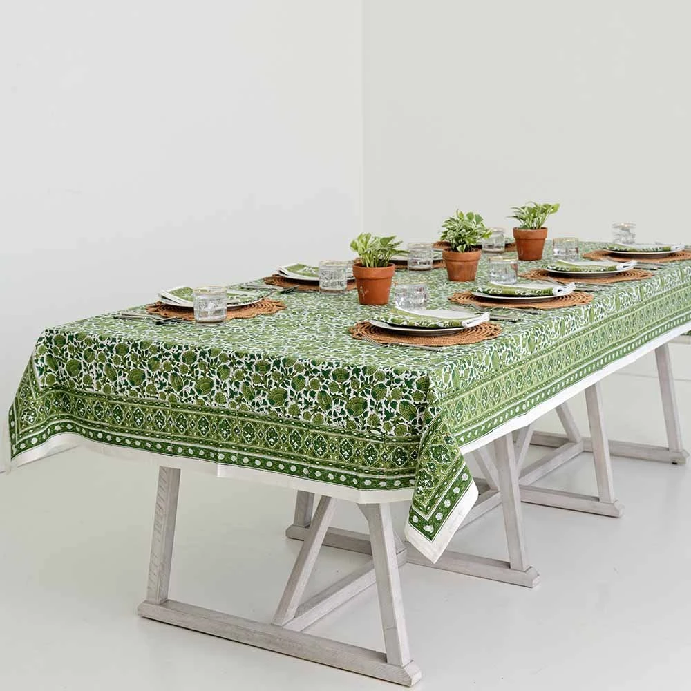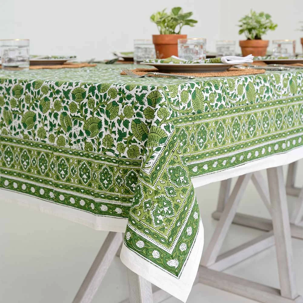 Freshen up your table for spring and summer! It is so easy to cheer up the family table with our exclusive vibrant green floral blossom block printed tablecloths. Large tablecloths for oblong and round tables. Effortlessly brighten up your table with cheerful Pomegranate tablecloths that improve with each washing, as they soften like your favorite sheets.