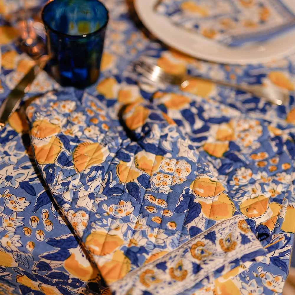 Our Lemon Grove print looks like it comes from the fields of Provence. Rich yellow hues and Provençal blue tones are reminiscent of traditional French textiles. Classic blue and yellow designed oven mitts, exclusive to Pomegranate, hand painted and hand block printed by skilled artisans. Oven mitt set complements matching apron and tea towels.