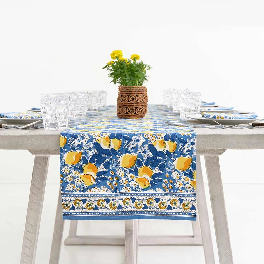Our Lemon Grove print looks like it comes from the fields of Provence. Rich yellow hues and Provençal blue tones are reminiscent of traditional French textiles. The classic blue and yellow design on this table runner, exclusive to Pomegranate, is hand painted and hand block printed by skilled artisans. Canvas table runner will finish off your table in style when paired with matching napkins.