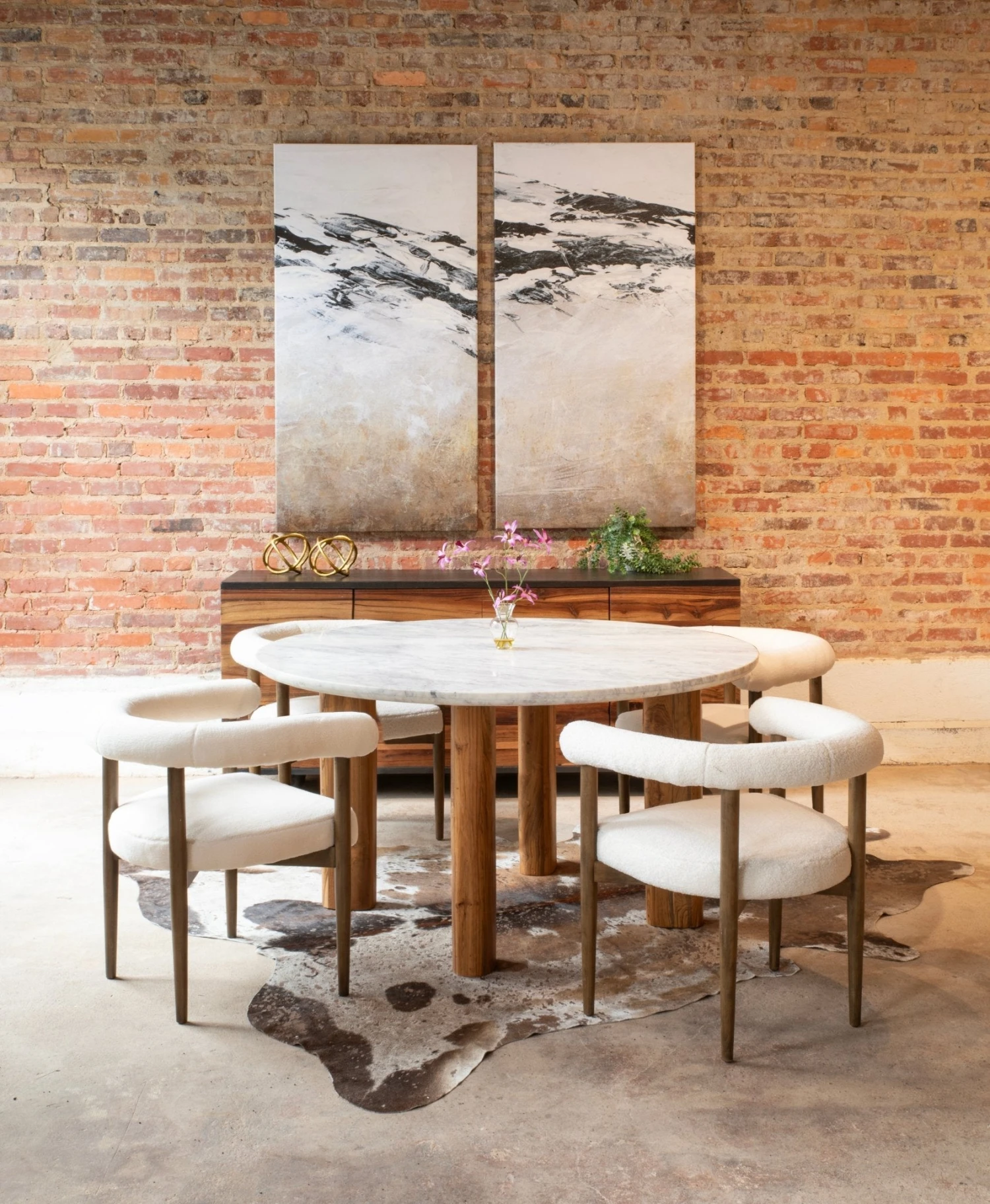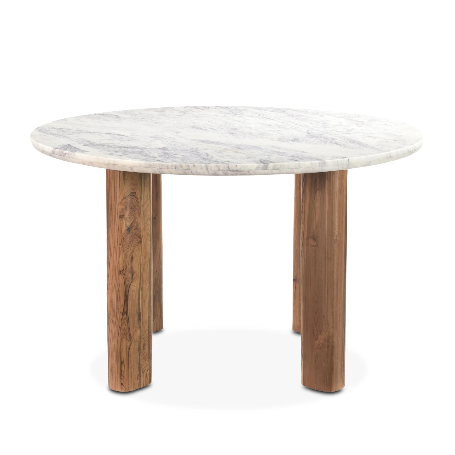 Mediterranean design with natural, vintage accents and smooth tops come together to complete the Madrid Collection. The reclaimed teak wood legs add a touch of rustic charm, while also providing stability and support for the smooth marble top. The natural knots and grain patterns in the wood add to the character and beauty of the piece. A combination of sleek marble top and warm, natural teak wood legs create a stunning and sophisticated look that will be the focal point of any dining space.Â