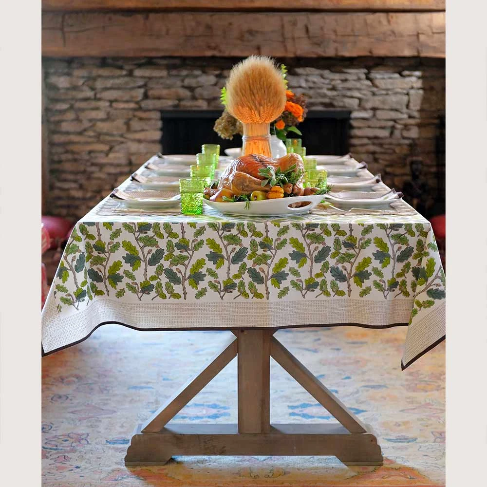 Foliage on your table never looked so good. Our exclusive maple leaf and acorn print is the perfect complement for your gatherings around the table. Rich greens and deep chocolate browns, are a perennial favorite around here. Hand block printed.