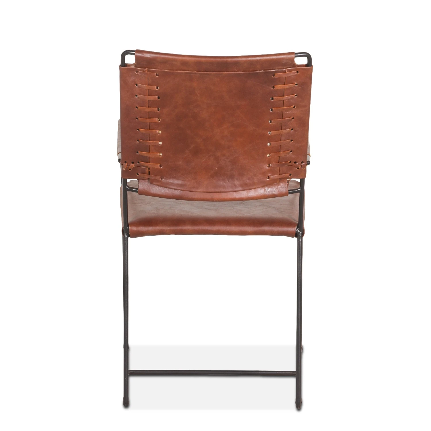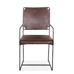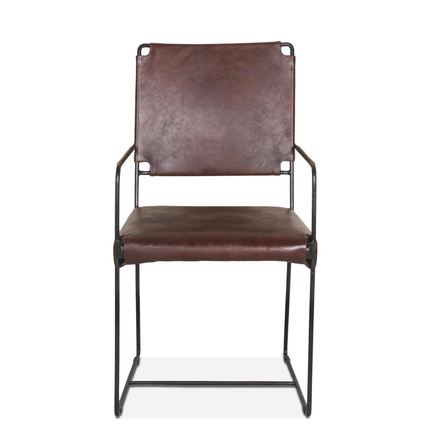 The Melbourne collection fuses industrial modern and mid-century designs. This beautiful yet simple armchair has a black reclaimed iron frame with sled style legs, enhancing the mid-century modern look of the piece. The seat and seat back are upholstered in a luxuriously leather and the seat includes a cushion for comfort and support. This sleek dining chair is pre-assembled and made with materials of the finest quality, making it an effortless addition to any home.