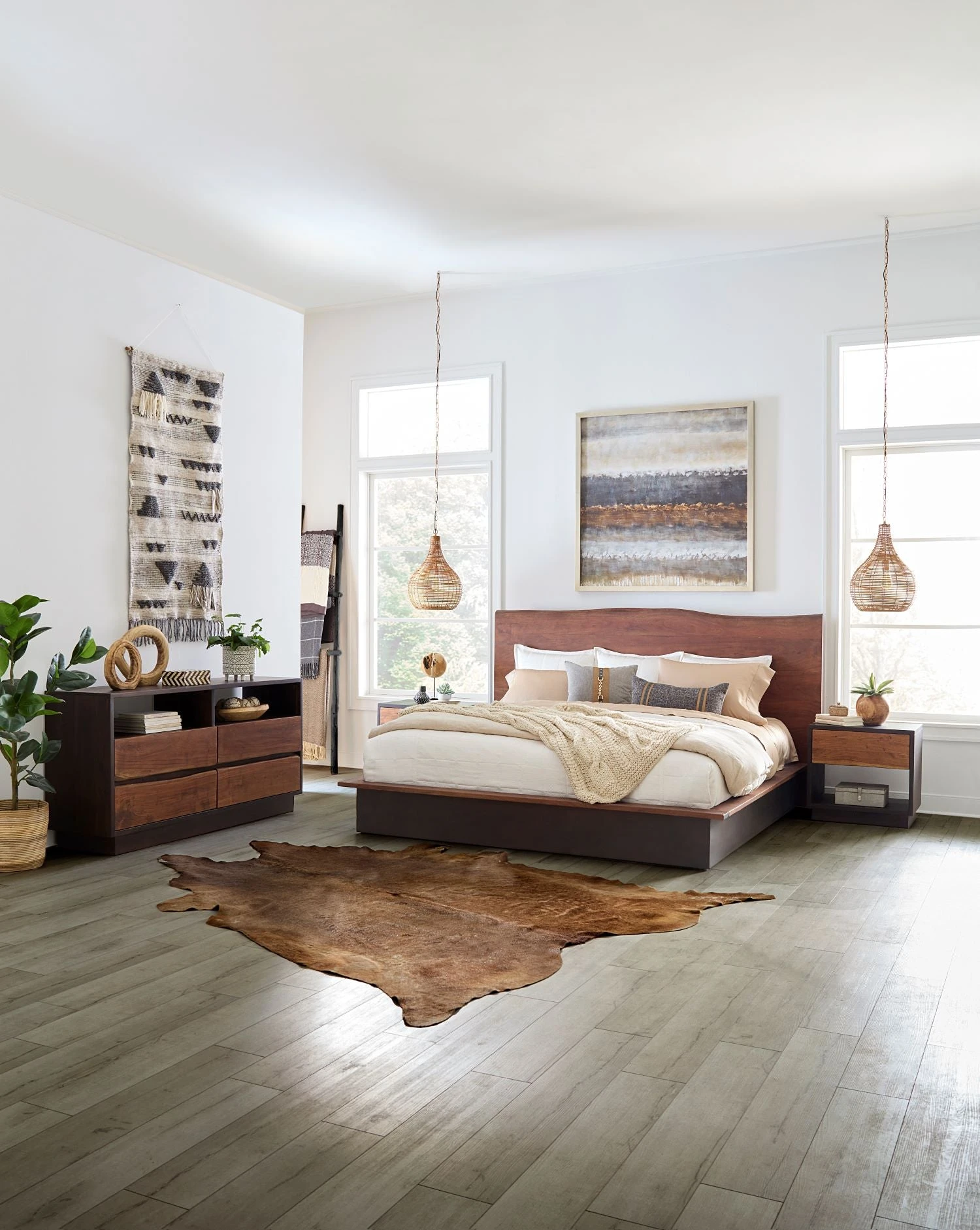 - Live edge headboard features uneven edges that contrast nicely with the clean, straight lines of the dark brown frame and base