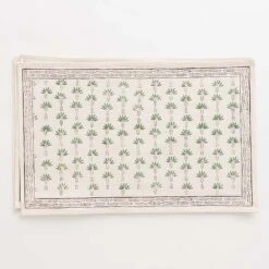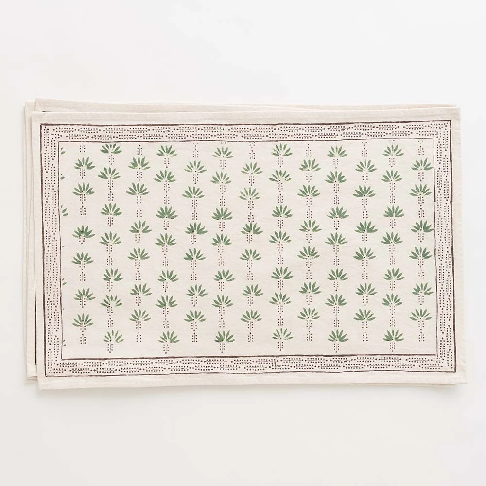 Exotic island palms stamp this island themed natural foliage green and chocolate brown cotton hand block printed table linen collection. Entertain in style, and complement your table with these cool original hand block printed table linens, that will add a touch of faraway travel to your day. Placemats sold as a set of four. Complete the set with matching hand block printed tablecloths, table runners and napkins.