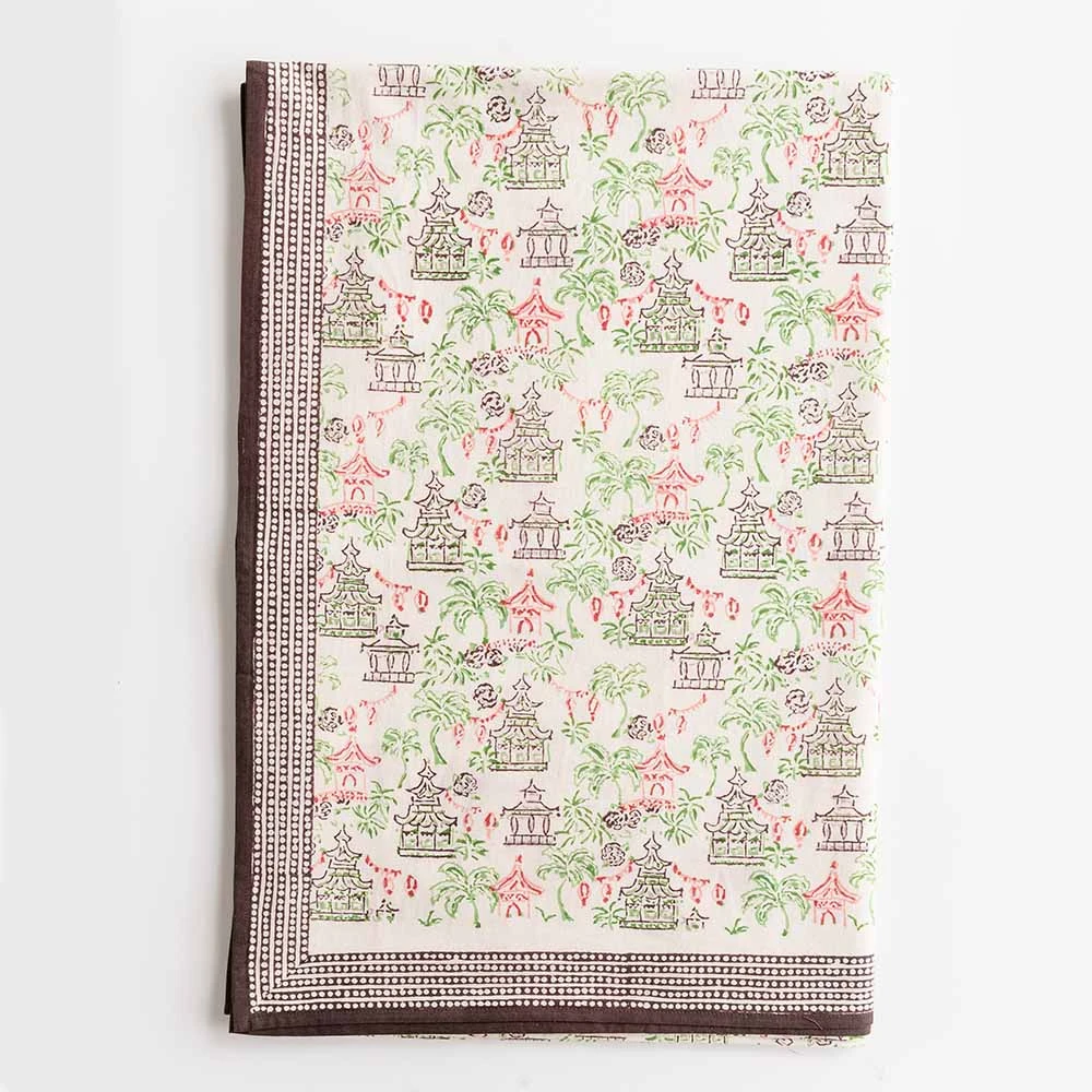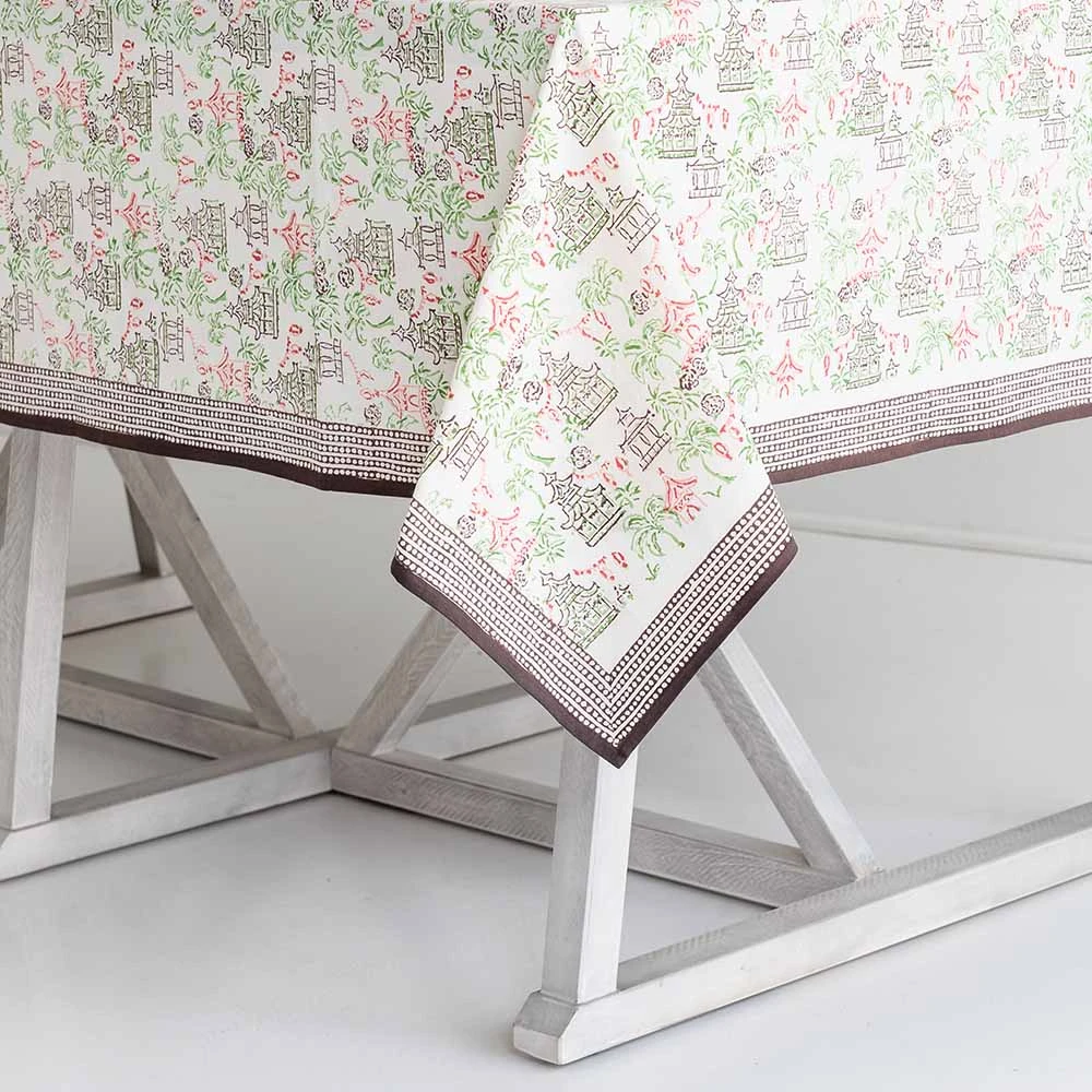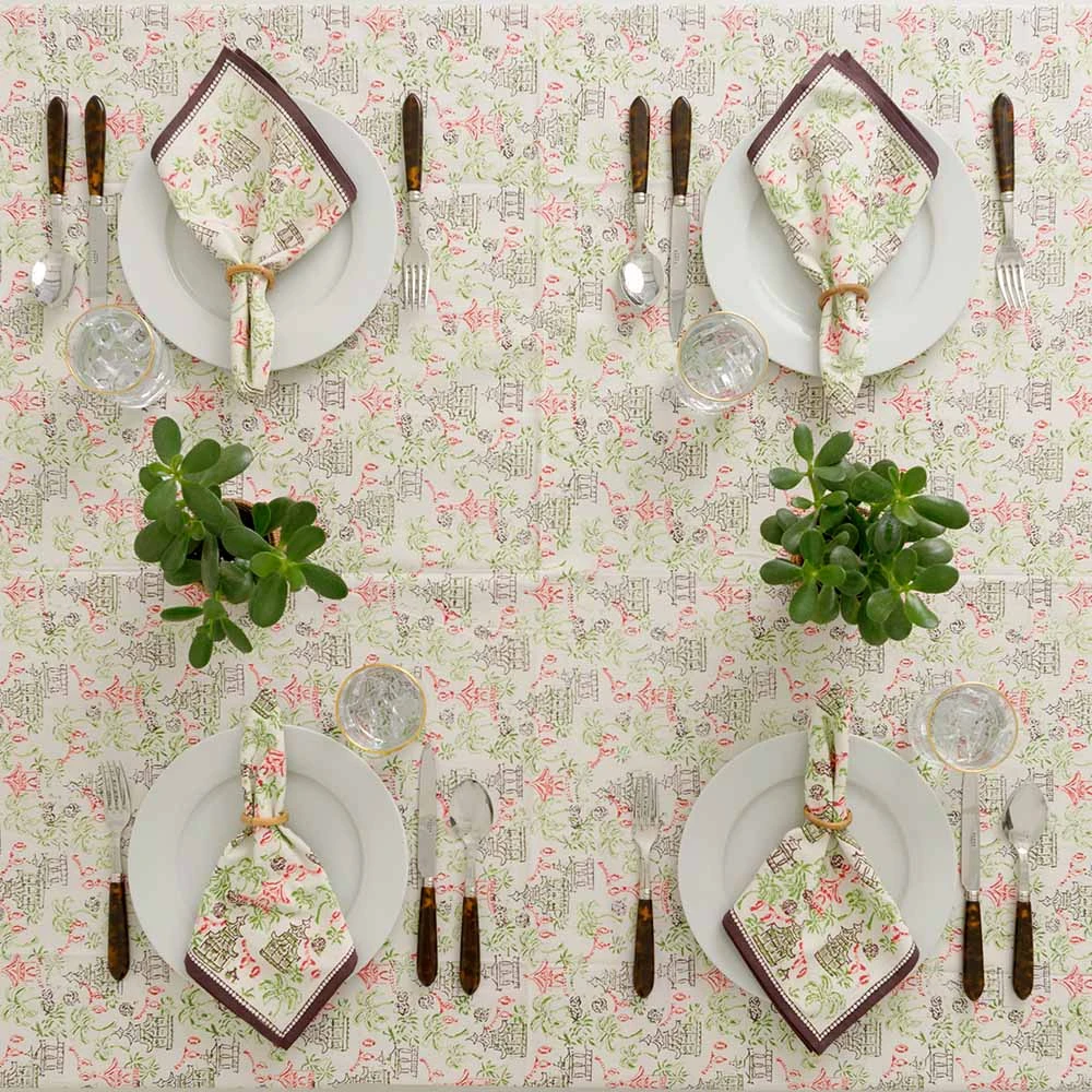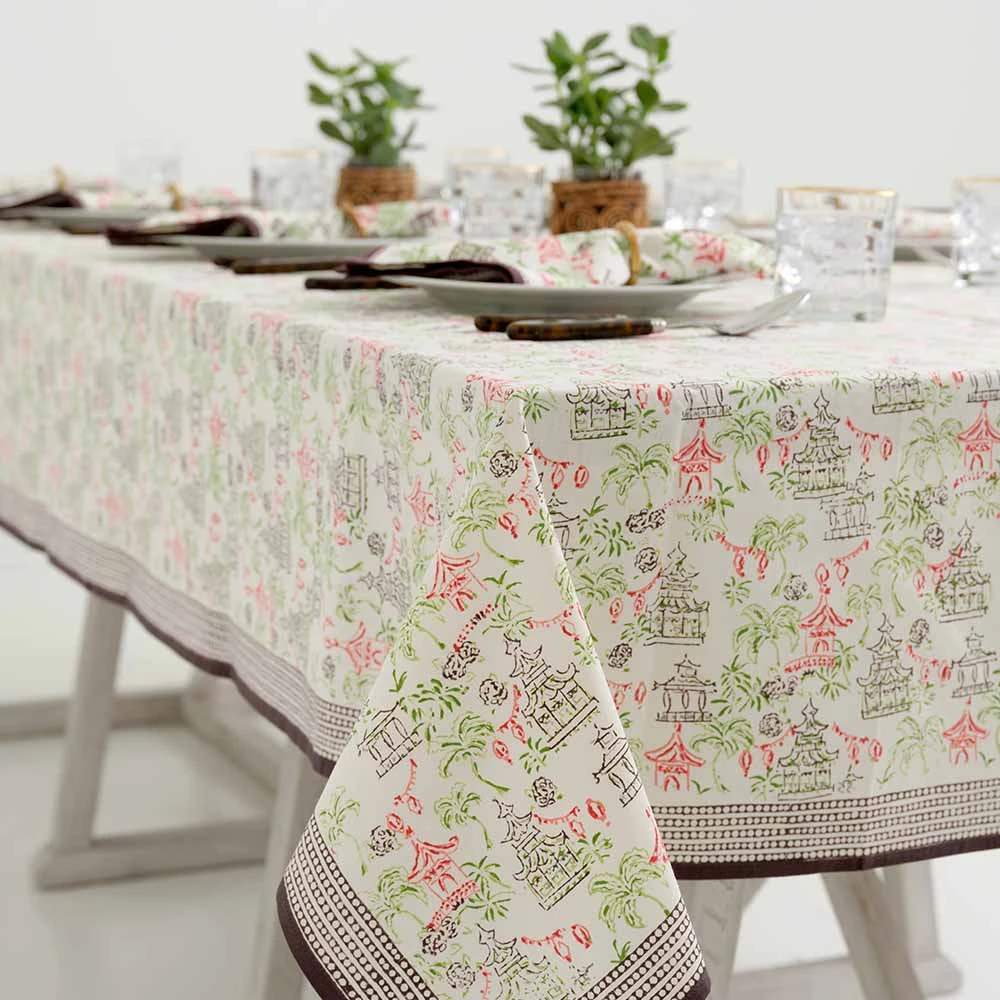 Exotic yet refined, our plams and pagodas cotton tablecloth in elegant hues of brown, fern and paprika orange is refreshing and unique, traditional and sophisticated, all at the same time. Elevate your table with the our latest recolor of one of our favorite prints in and pair with matching placemats and napkins. A lovely updated tablescape essential for gatherings around the table. Available in assorted sizes.