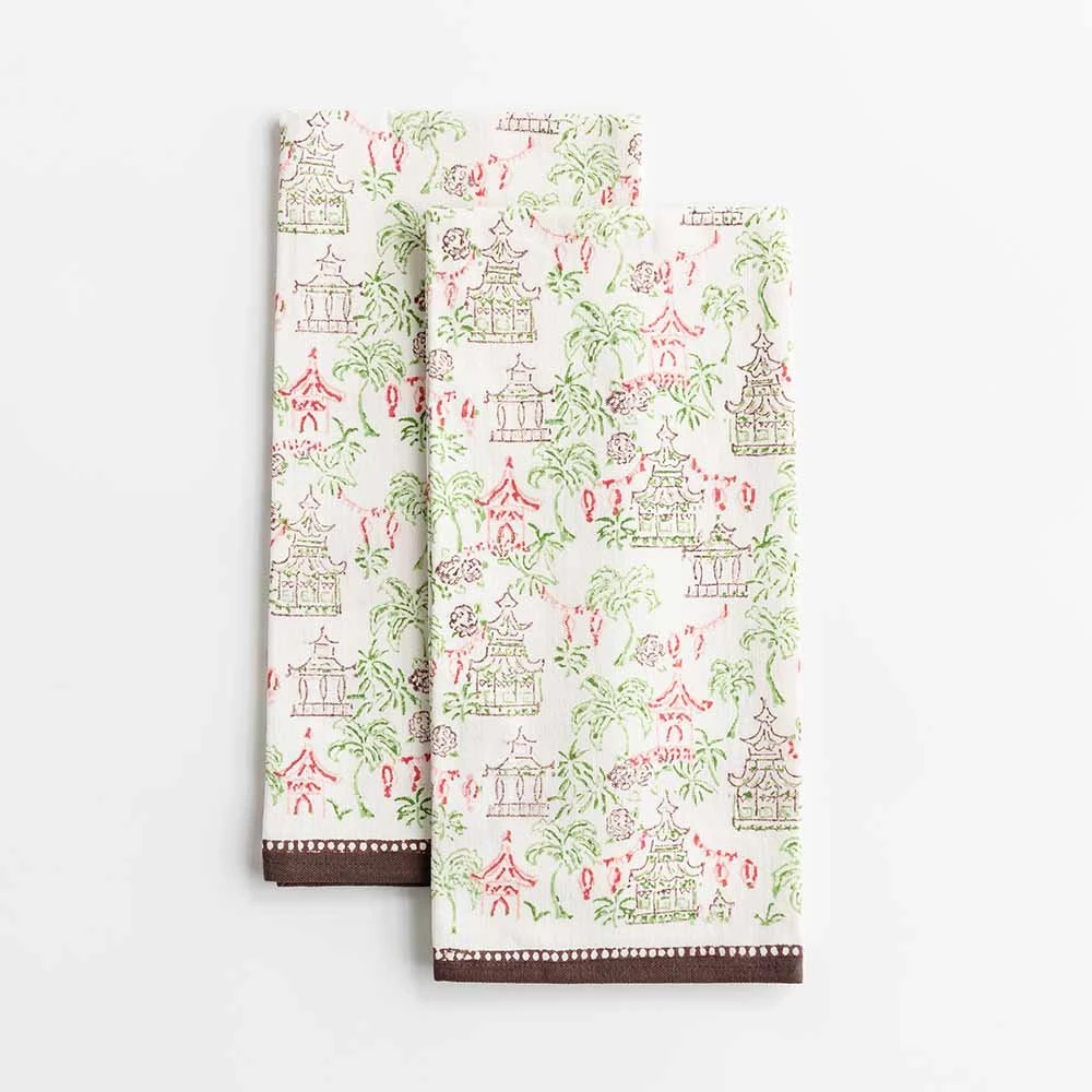 Glam up the kitchen with our plams and pagodas printed tea towels in elegant hues of brown, fern and paprika orange.Refreshing and unique, traditional and sophisticated, this print is cool and fun. Elevate your kitchen with the our latest recolor of one of our favorite prints and pair with matching apron and oven mitt set.