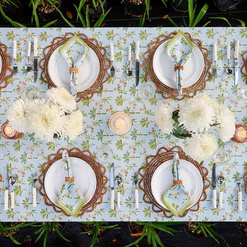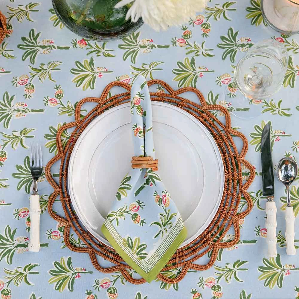 Tropical island palms and pineapples adorn this coastal themed light blue and green Pomegranate hand block printed cotton tablecloth. Complement your breakfast, lunch and dinner table with these refreshing and original table linens. Pair with matching napkins, table runners and placemats to complete the coastal look.