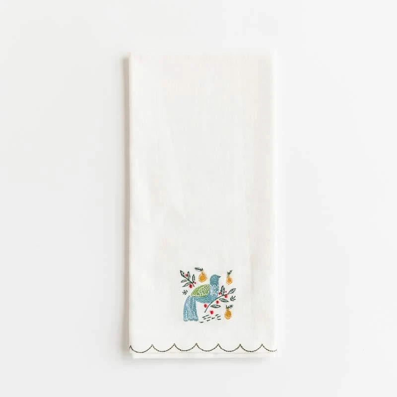 This cute Christmas-themed embroidered tea towel features a blue partridge perched among pears and branches.
