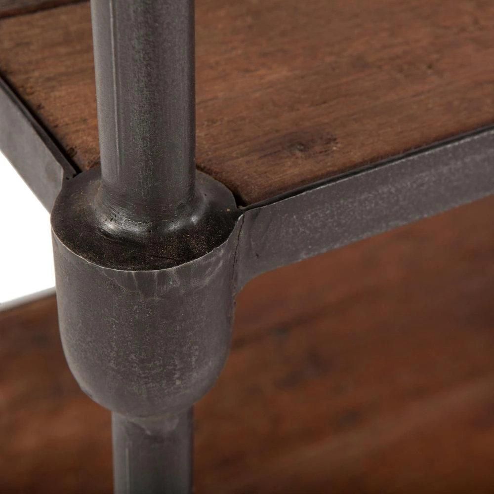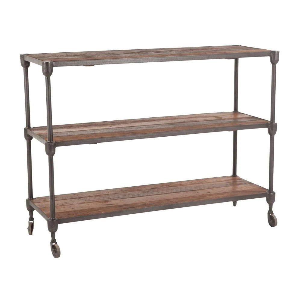 This console table’s frame is recycled iron in gray zinc finish, along with the four operable wheels affixed to the base that afford ease of transportability. With two thin shelves, you can use this console table to display all your favorite pictures, movies and electronics. The console table features a panel design on the reclaimed teak shelves.