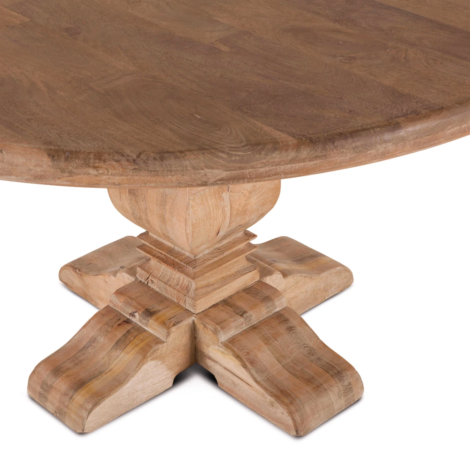 - This beautiful round dining table is made of solid mango wood, includes a pedestal base with unique, hand-carved decorative features