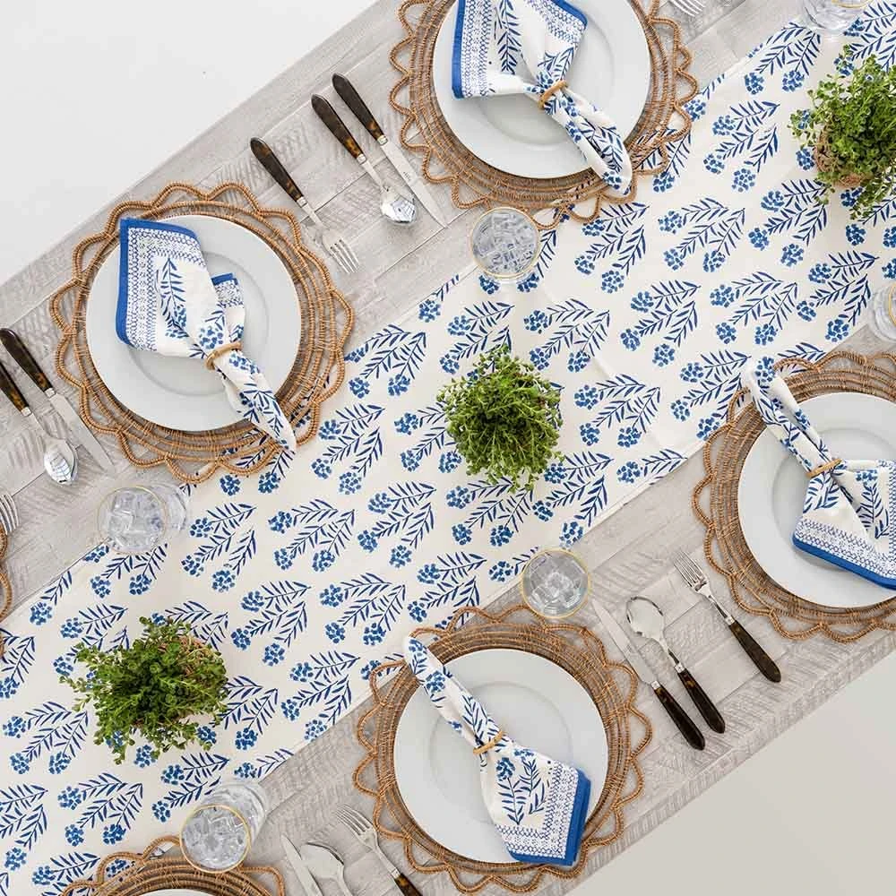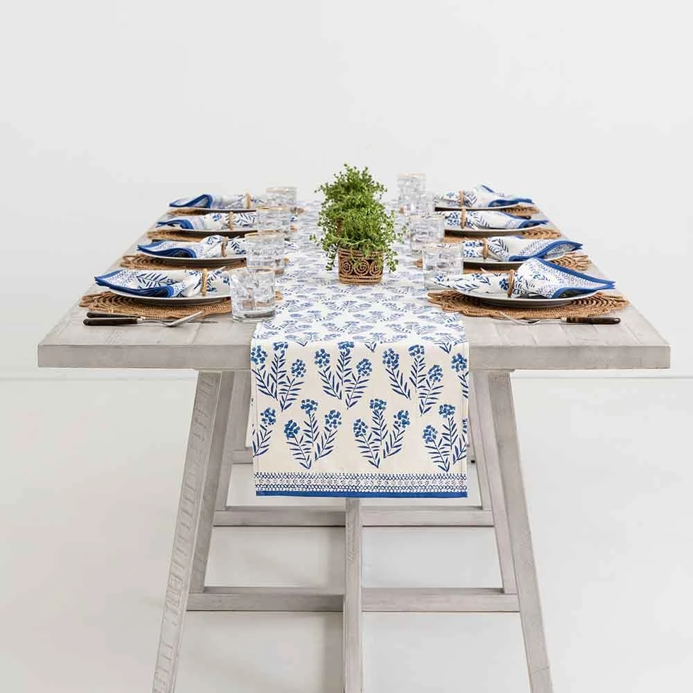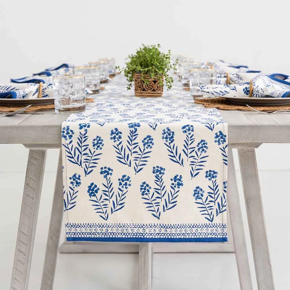 Our Phlox Blue print enlivens a table with botanical charm featuring a bright blue block-printed Phlox flower that sways along the table. This Table Runner adds an unexpected jolt of joy and energy to a breakfast nook or dinner table.