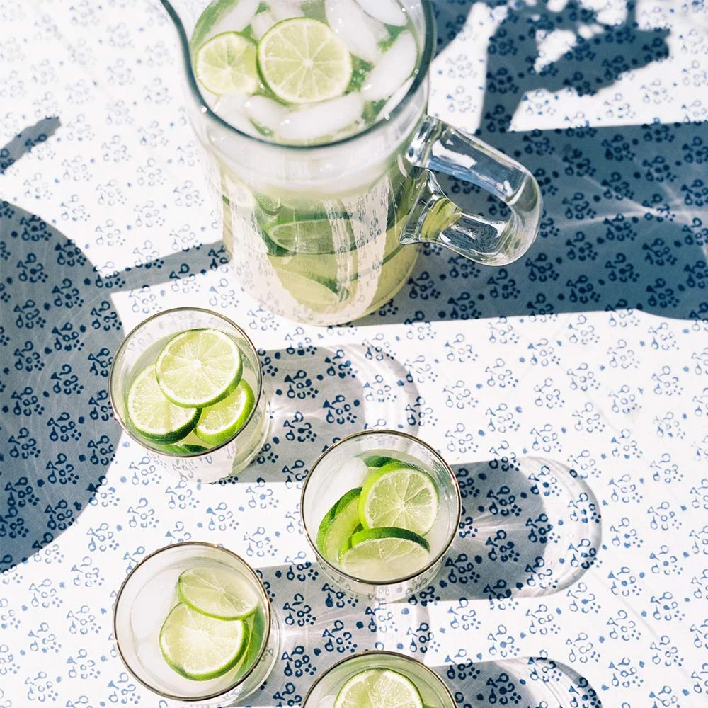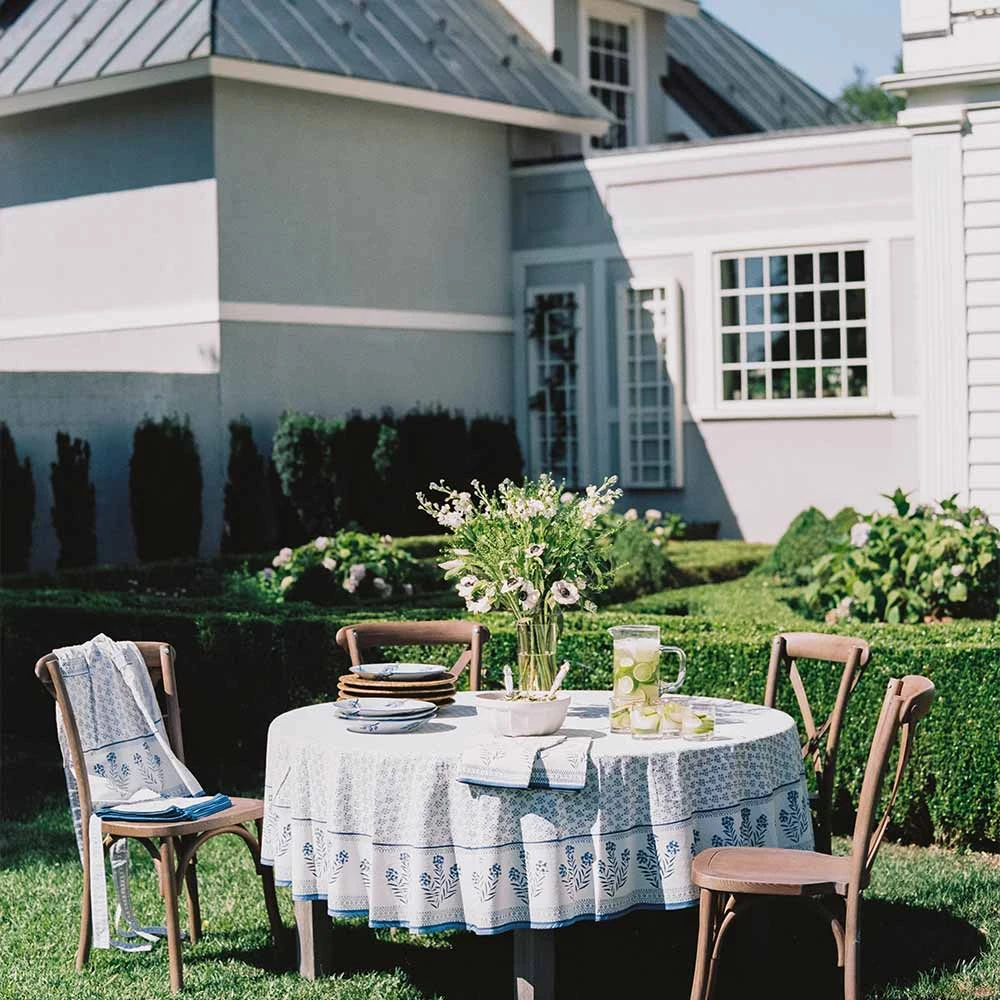 Our Phlox Blue print enlivens a table with botanical charm. The cloth features a bright blue block-printed Phlox flower that dances across the tablecloth, accompanied by a modern booti print. Available in a variety of sizes, this tablecloth adds an unexpected jolt of joy and energy to a breakfast nook or dinner table.