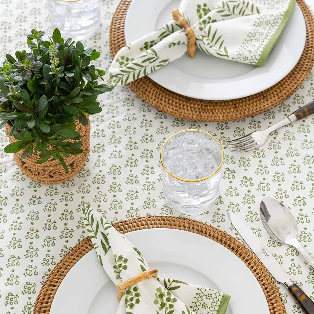 Our crowd-favorite Phlox print is reimagined in a vibrant, fern green that livens up any table with freshness. Grouped in happy clusters of three, the flowers look as though they’re swaying in a breeze, evoking the feeling of dining in a meadow or an orchard. This tablecloth pairs well with napkins in Phlox Green or Phlox Blue or alternate prints such as Pomegranate Green or Emma.