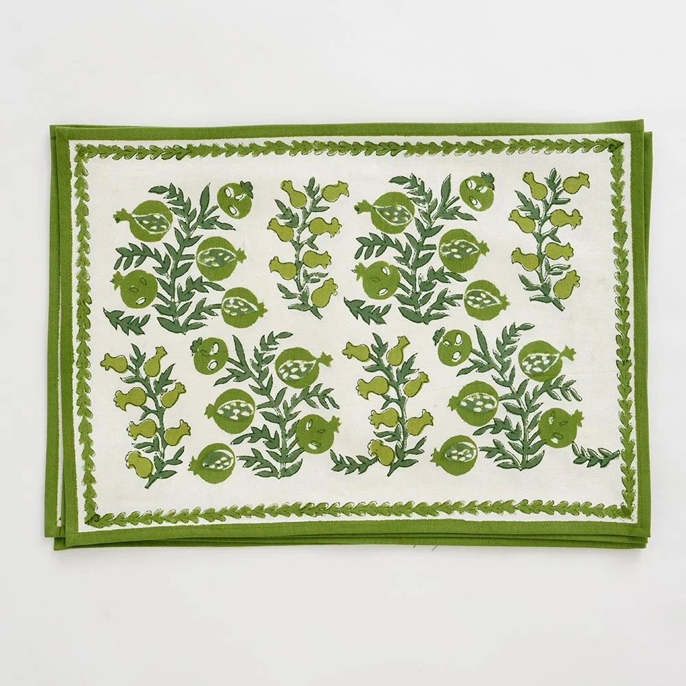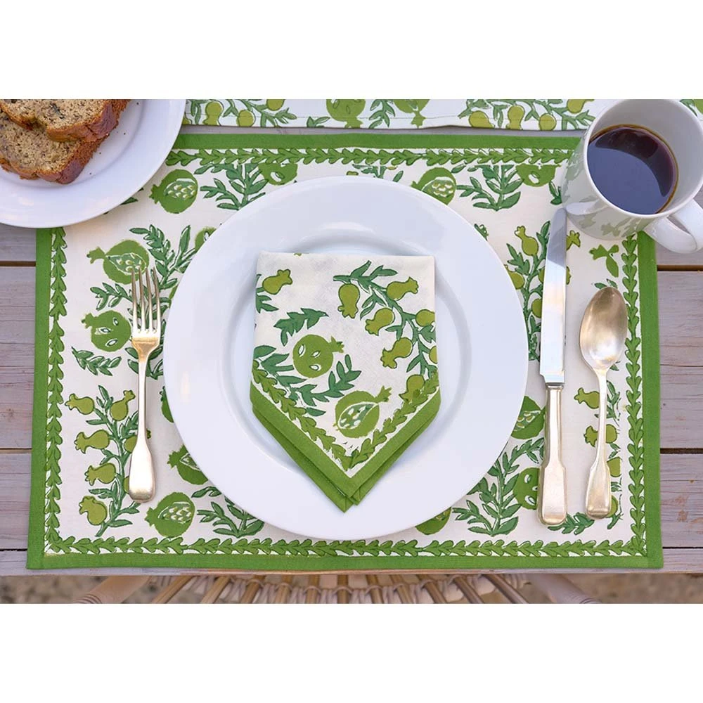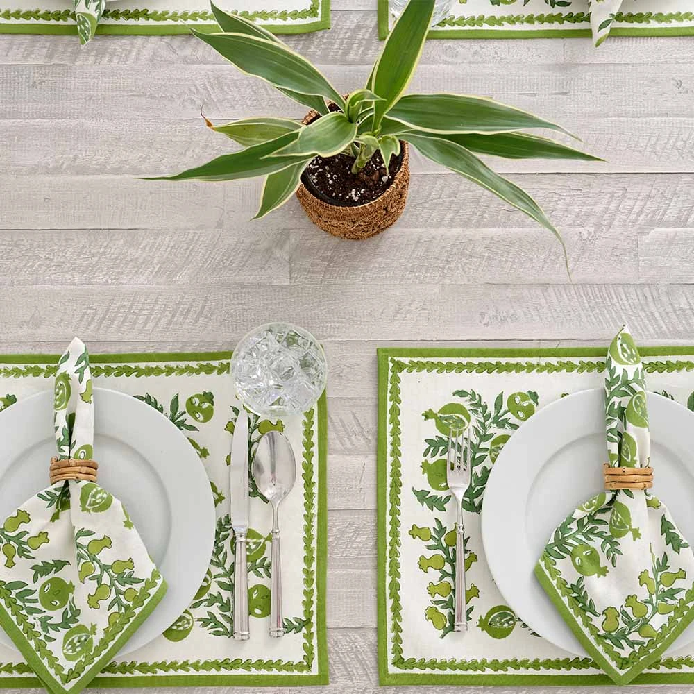 These cheerful hand block printed placemats will brighten up your table and cheer up your day. Perfect for casual everyday use as well as entertaining and gatherings with family and friends. Inside, outside, in the garden and up in the mountains, they fit in everywhere! Pair with matching tablecloth and napkins to complete the elegant yet casual look.