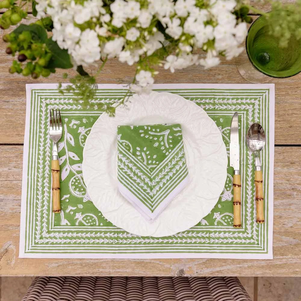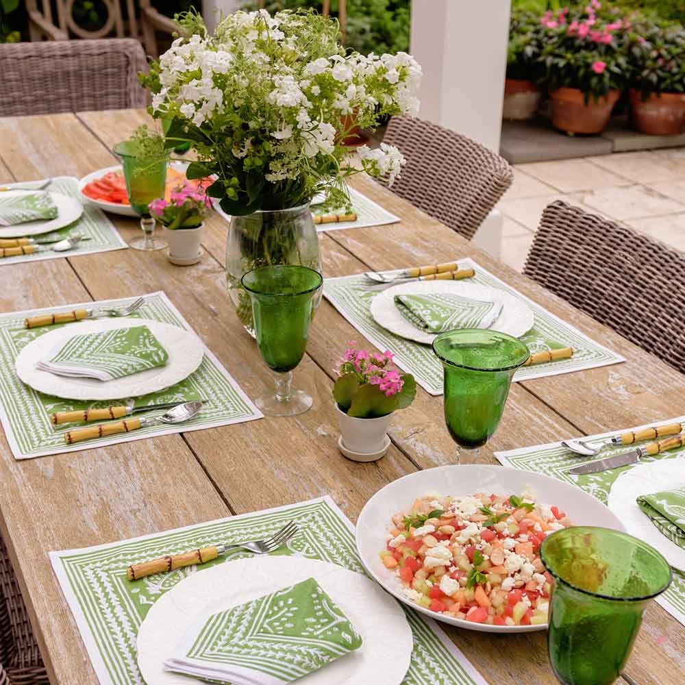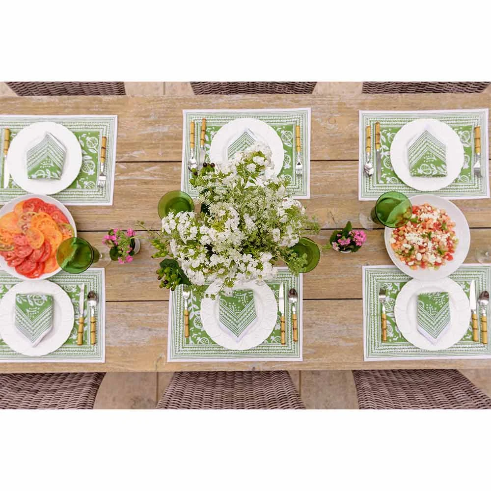 With a play off of our brand’s signature print, Pomegranate Blue, we recolored this print in a new vibrant shade of green. Decorated in a distinctive, handpainted Pomegranate surrounded by lively fleurettes and a complimentary border, these placemats add a rich layer to your table setting.