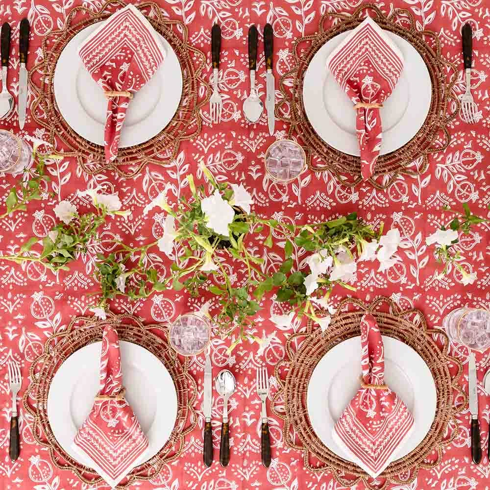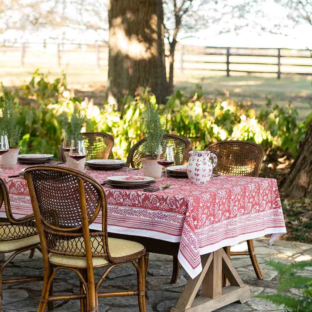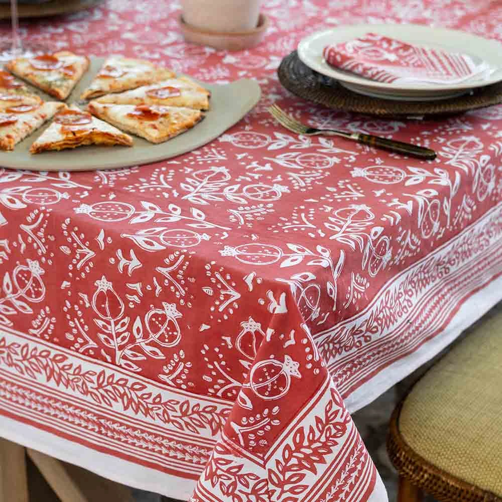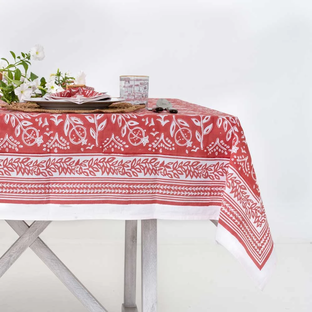 Pomegranate Poppy is the latest colorway of our brand’s signature print. Decorated in a distinctive, handpainted Pomegranate surrounded by lively fleurettes and a complimentary border, this tablecloth is a great foundation piece for indoor or outdoor entertaining