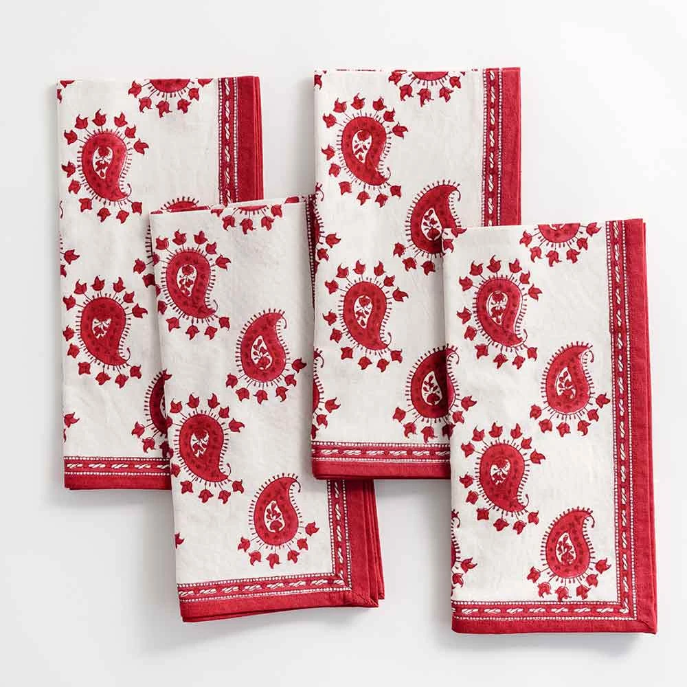 These red paisley napkins will bring lovely charm to your dining experience. Made with 100% Cotton fabric these dinner napkins are soft cloth napkins which provide a light but cozy feel to your dining table. Set of 4 each 20” x 20”. These cloth napkins are a great way to make your dining table welcoming. Pair with one of our tablecloths, placemats, or table runners for the complete effect.