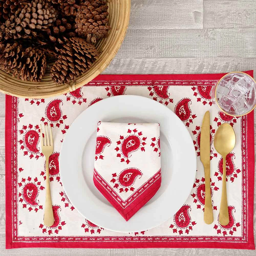 These red paisley placemats will bring lovely charm to your dining experience. Made with 100% Cotton fabric these placemats provide a light but cozy feel to your dining table. Set of 4 each 13” x 19”. These placemats are a great way to make your dining table welcoming. Pair with one of our tablecloths, napkins, or table runners for the complete effect.