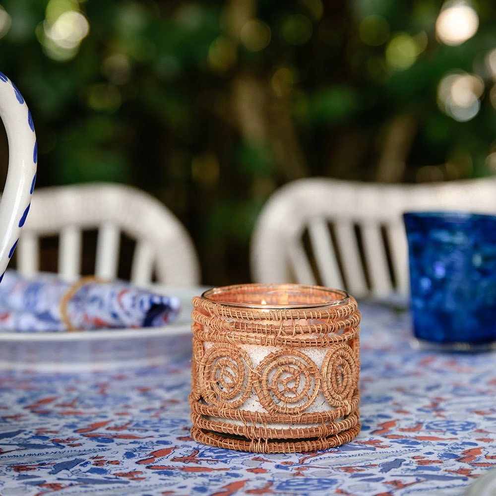 Our exclusively hand crafted votive candle/small vase holders are the perfect addition to your chic and casual table. Beautiful details in the natural woven technique bring an elevated yet relaxed mood to your table setting. Versatile design opens up the end use possibilities; votive candle, small vase, chic Sterno holder (for the pesty flies)