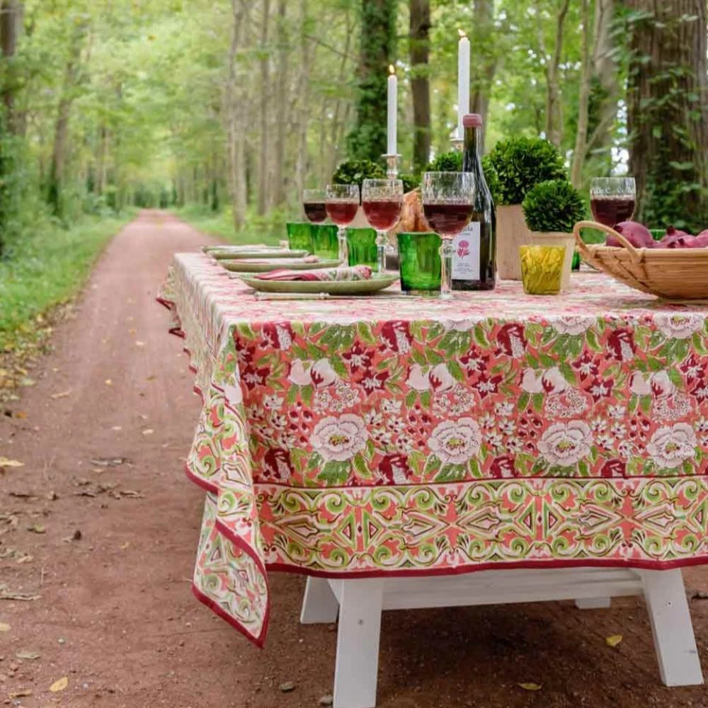 The rich red hues, paired with elegant coral, rose, and fern green of this fall version of the original Pomegranate print is both rustic and elegant. The palette is suitable for Autumn entertaining, complementing the rich warm hues of fall outdoors and brings the warmth inside as the temperatures drop. The deep garnet edge, soft blush pink, rich coral and subtle greens embedded in these hand block printed linens add warmth and personality to your fall tablescape. Tablecloths shown here.