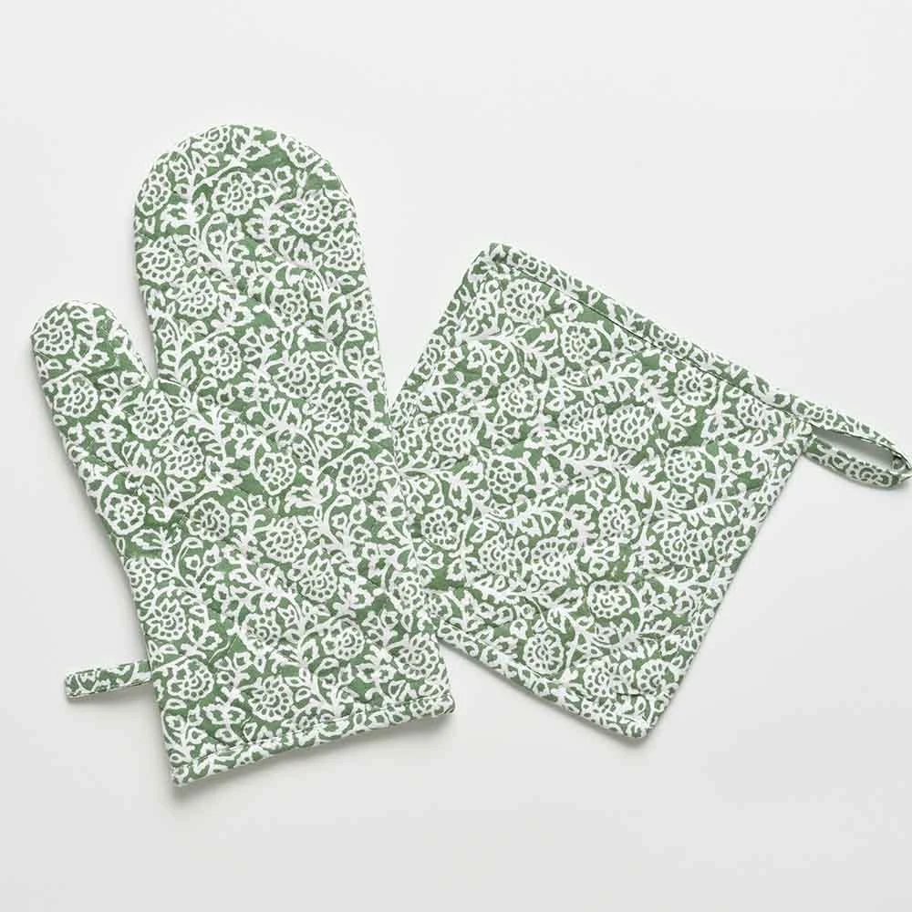 This updated traditional classic green and white hand block printed Tapestry Green Oven Mitt was designed to symbolize the weaving of stories that are shared during meals. Explore conversations with family, friends, and guests that remind us of the beauty of details and encapsulates the tapestry of your entertaining.